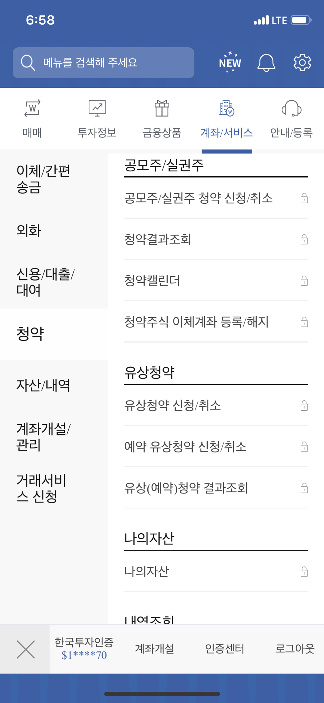 한국투자증권에서 카카오게임즈 공모주 청약방법도 KB증권에서 진행하는 방법과 동일하게 간단합니다. 한국투자증권 애플리케이션을 실행하고 하단 좌측의 메뉴를 클릭합니다. 좌측 메뉴를 누르고 계좌/서비스>청약>공모주/실권주 청약 신청/취소를 누르면 공모주/실권주 청약신청을 할 수 있는 페이지로 이동합니다.