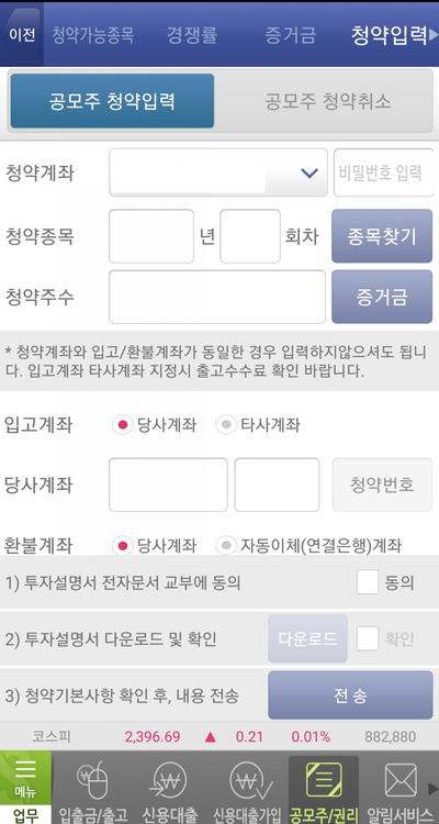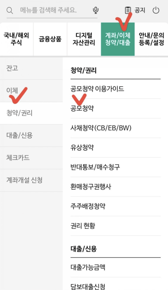계좌/이체/청약/대출 상단 배너를 누른다음 청약/권리를 눌러 공모청약을 클릭하면 됩니다. 아직 빅히트 공모 청약일이 아니어서 화면에는 나오지 않지만, 10월 5일 ~ 10월 6일동안 공모청약신청에 빅히트 공모주를 신청할 수 있게 화면에 노출되게 될 것 입니다.