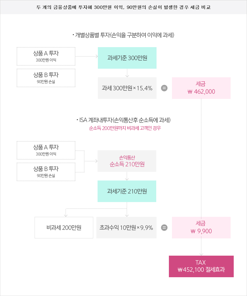 ISA계좌를 통해 투자한 경우 이익과 손실을 통산 순소득에 대하여 과세하기 때문에 개별상품별 투자를 했을 경우에 비해서 훨씬 많은 세금을 절약할 수 있습니다.