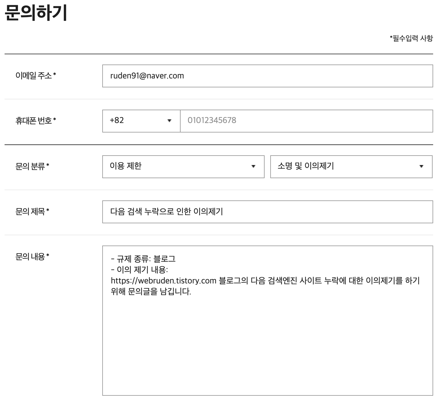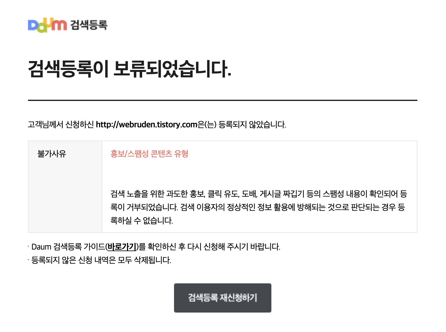 티스토리 고객센터에 소명 및 이의제기를 한 결과 저는 다음 겸색결과에 티스토리 블로그가 다시 정상적으로 사이트 등록이 된 것을 확인할 수 있었습니다. 만약 이의제기를 했음에도 불구하고 사이트 등록이 되지 않았다면, 처음에 검색 등록 보류되었다는 안내 메일처럼 거절된 사유에 대한 내용이 포함된 메일이 날라오게 될 것입니다.