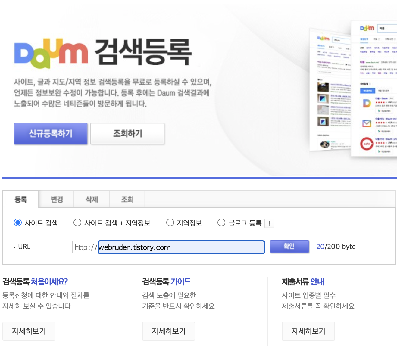 Daum 검색등록 사이트, 글과 지도/지역 정보 검색등록을 무료로 등록하실 수 있으며, 언제든 정보보완 수정이 가능합니다. 등록 후에는 Daum 검색결과에 노출되어 수많은 네티즌들이 방문하게 됩