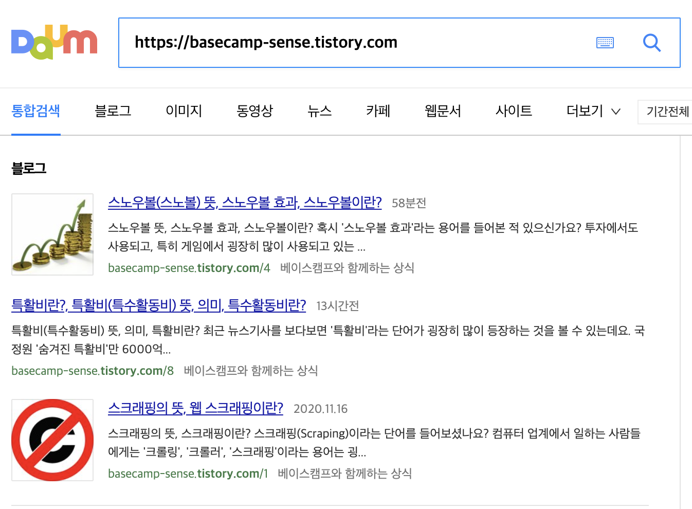 만약 블로그를 생성한지 며칠 지나지 않은 티스토리 블로그의 상태는 어떨까요? 글을 작성했지만 블로그를 생성한지 며칠 지나지 않은 티스토리 블로그는 역시 사이트가 아직 다음 검색에 등록되지 않았기 때문에 내 블로그 포스팅만 노출될 뿐 사이트가 등록되지 않은 것을 확인할 수 있습니다.