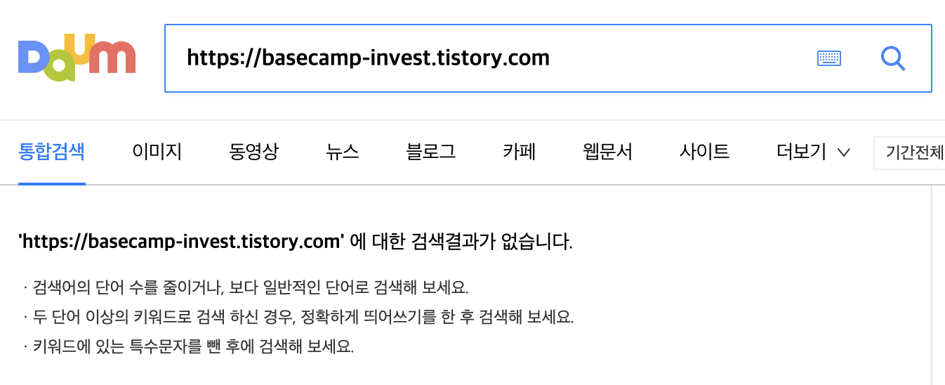 실제 블로그를 처음 생성했을 시점이나 블로그를 생성한지 얼마 안되었다면 위 케이스와는 조금 다른 모습일 것입니다. 만약 블로그를 처음 생성했다면 다음 검색엔진에 아직 등록되지 않았기 때문에 통합검색에 아예 검색결과가 없다고 뜹니다.