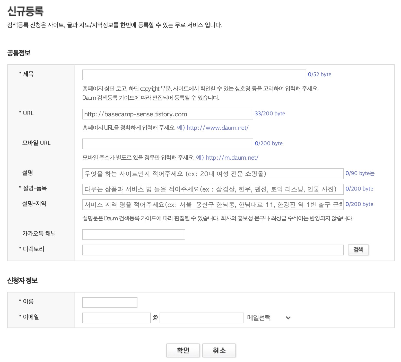 좀 더 정확하게 진단하기 위해서 고객센터를 이용해봅시다. 티스토리 블로그 URL을 등록하기 위해 다음 검색등록 사이트로 이동합니다.