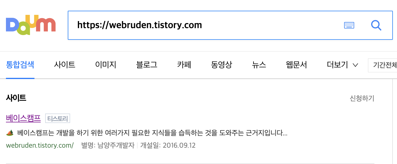 다음 검색창에 자신의 웹사이트 URL을 검색창에 입력하고 검색합니다. 아래처럼 자신의 URL을 다음 검색에 검색했을 때 사이트에 등록되어야 실제 정상적으로 다음에서 해당 티스토리 블로그의 포스팅을 다음 알고리즘 기반으로 순위를 매겨서 등록시켜줍니다.