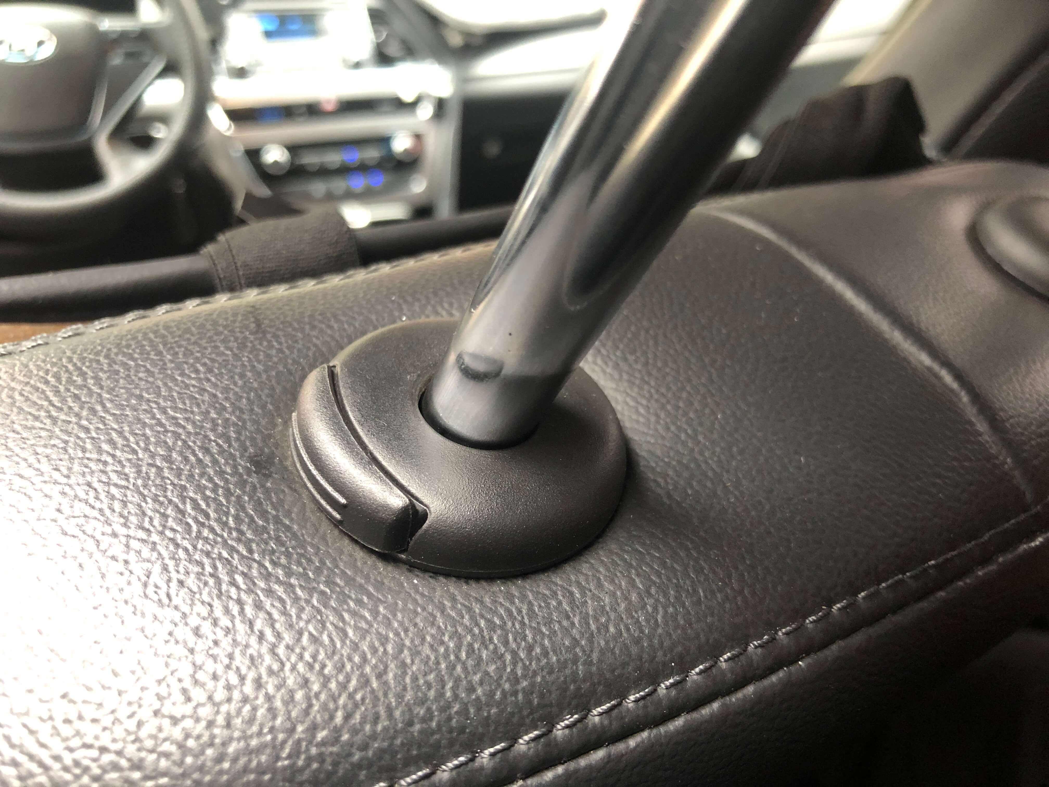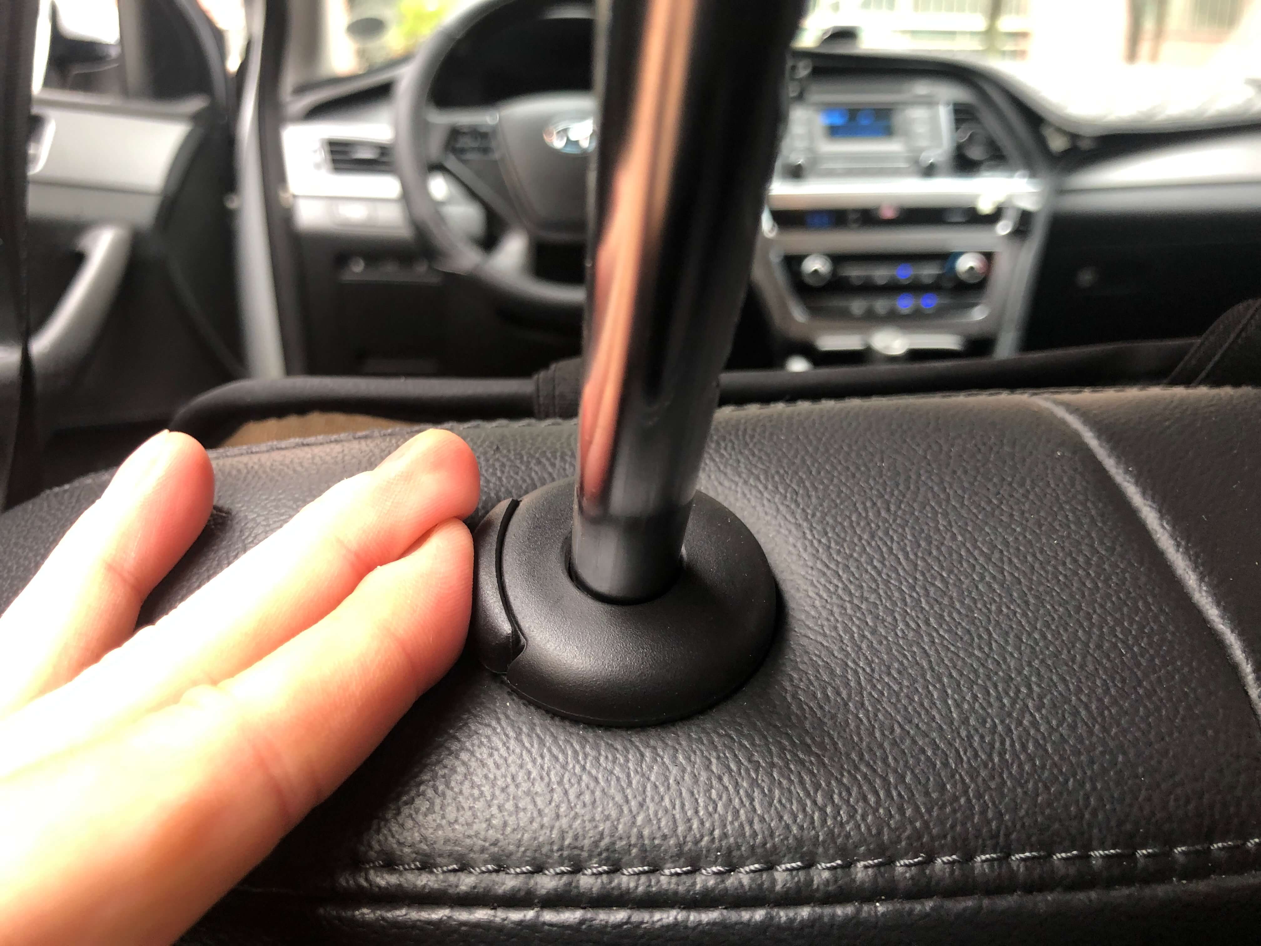 시트를 뒤로 젖혔다면 좌석 헤드레스트를 꽂는 부분을 보면 아래 이미지와 같이 사이드에 누르는 버튼이 있습니다. 이 버튼을 누르고 헤드레스트를 위로 쭉 당기면 헤드레스트가 쭉 뽑히게 됩니다.