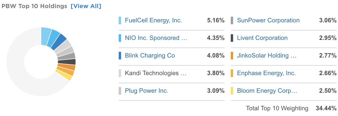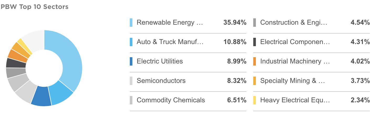 PBW의 상위 10개 섹터 구성은 아래와 같습니다. 신재생에너지 관련 ETF인 만큼 신재생 에너지 (Renewable Energy Equipment & Services) 관련 섹터의 비중이 35.94%로 포트폴리오의 1/3을 차지하고 있는 것을 볼 수 있습니다. 이외에 자동차 및 트럭 제조업체(Auto & Truck Manufacturers) 섹터가 10.88%로 테슬라, 니오, 캉디와 같은 전기 자동차 제조업체의 비중 때문에 10%정도의 비중을 차지하고 있는 것을 알 수 있습니다.
