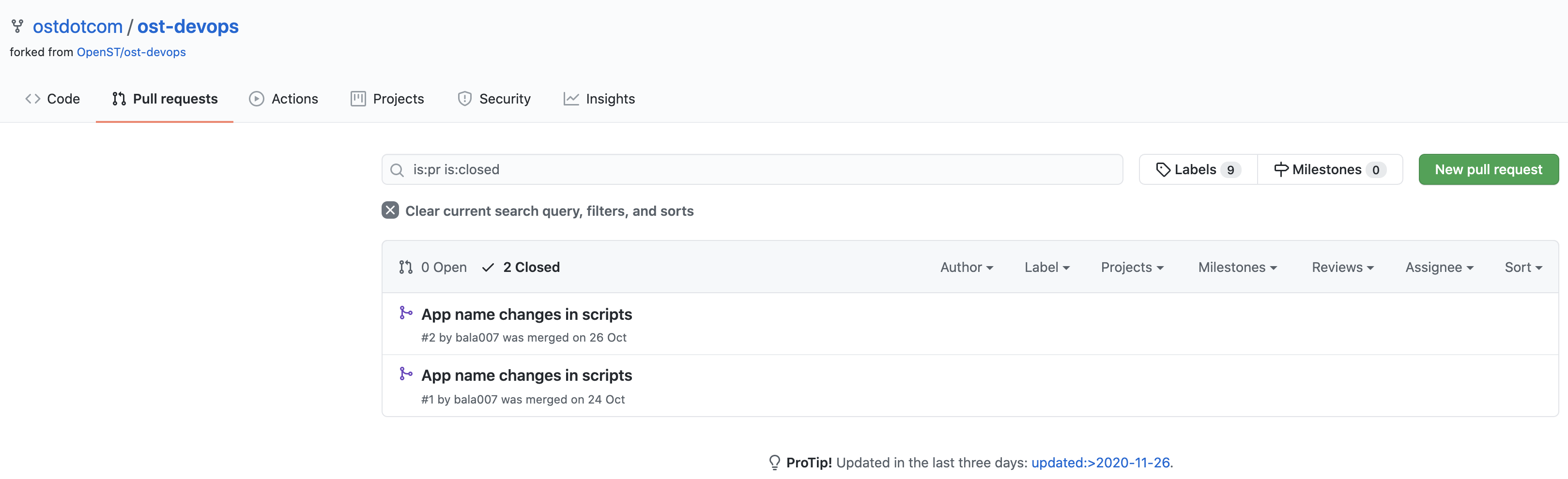 ost-devops repo의 Pull requests를 살펴보는데 closed된 목록이 2개밖에 존재하지 않네요.