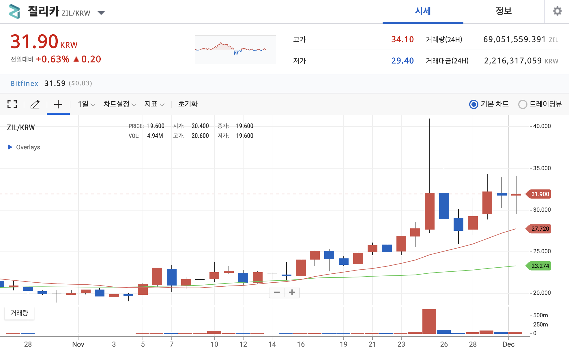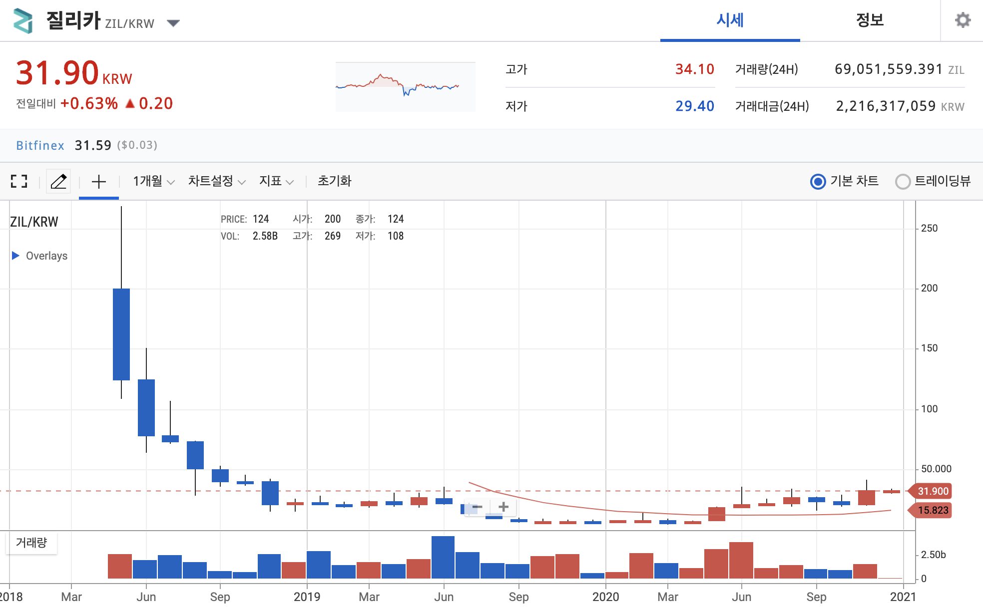 질리카 코인의 현재 시세 상황은 업비트 기준으로 상장버프를 받고 조금 오르는듯 싶더니 얼마 지나지 않아 상장일부터 지속적으로 우하향을 그리다가 최근들어서 우상향을 보여주고 있는 모습입니다.