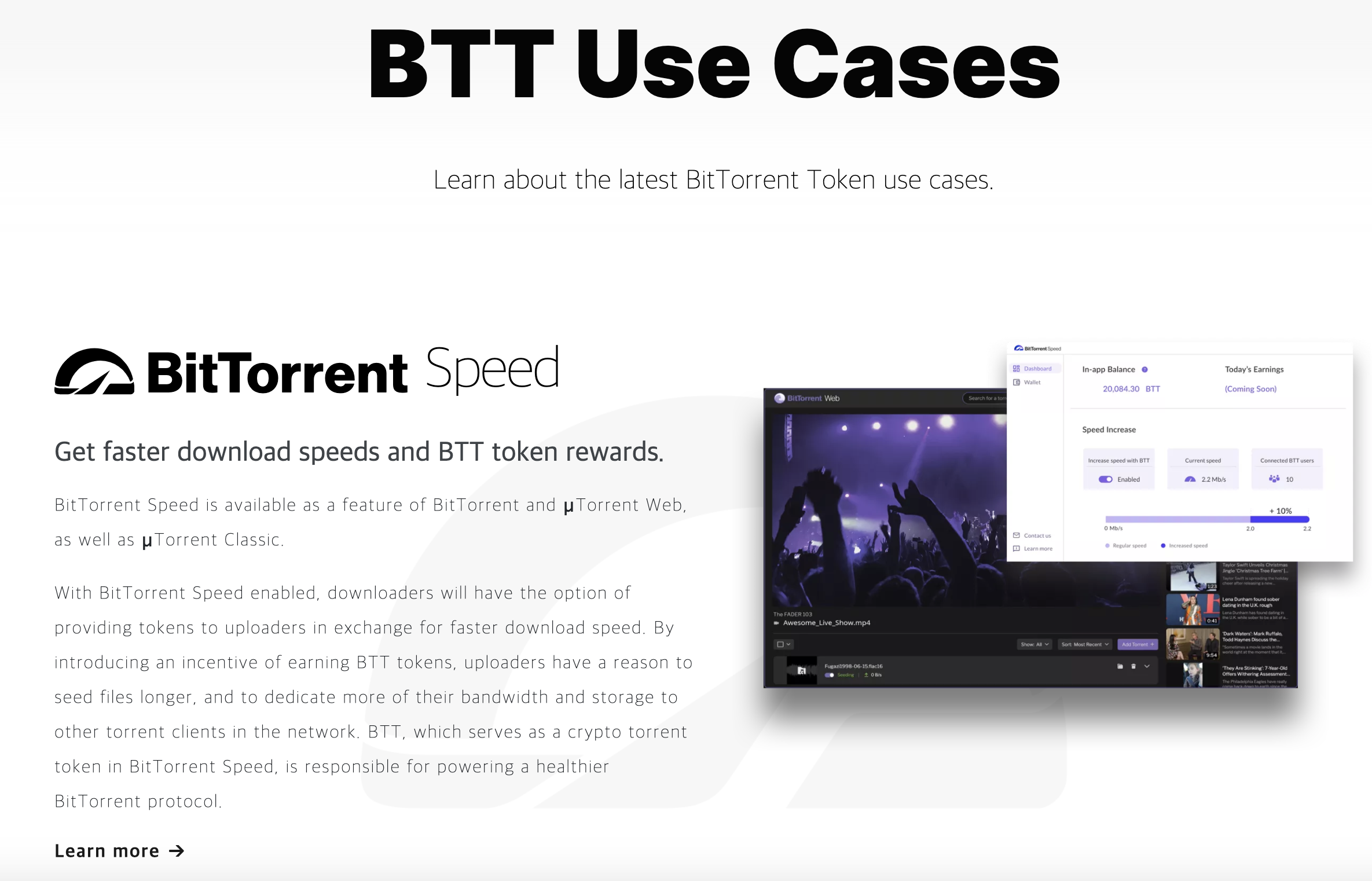 토렌트는 혁신적인 파일 공유 시스템이었지만, 파일을 다운로드 완료한 이후에는 시드를 계속 유지하여 다른사람들과 파일 공유 혜택 공유할 유인이 존재하지 않았습니다. 비트토렌트는 트론 네트워크를 이용한 BTT 토큰 발행 및 프로그램 통합을 통해 원활한 시드 유지에 대한 동기를 제공하고자 하였습니다. 더불어 유저들은 희소성 높은 자료의 시드를 유지할 때 보다 큰 보상을 받게 되며, 토큰을 사용하지 않는 유저들 또한 증가된 시드들로 인해 기존보다 더 빠르고 다양한 파일들을 공유받을 수 있게 됩니다.