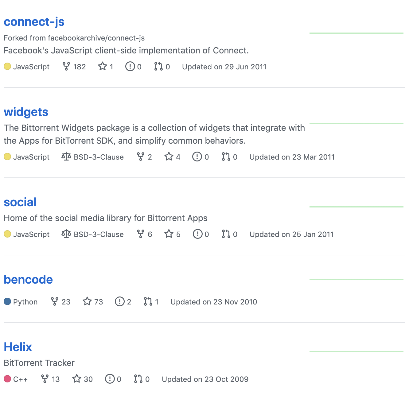 실제 비트토렌트 개발자들이 해당 깃허브 계정에 비트토렌트 토큰과 관련된 프로젝트를 개발하고 있는지가 궁금해서 전체 저장소를 한번 살펴봤습니다. 비트토렌트 깃허브 프로젝트에서 2009년부터 쭉 저장소가 추가되면서 관리된 것을 보면 개발 저장소로 현재까지 사용하고 있는 것 같습니다.
