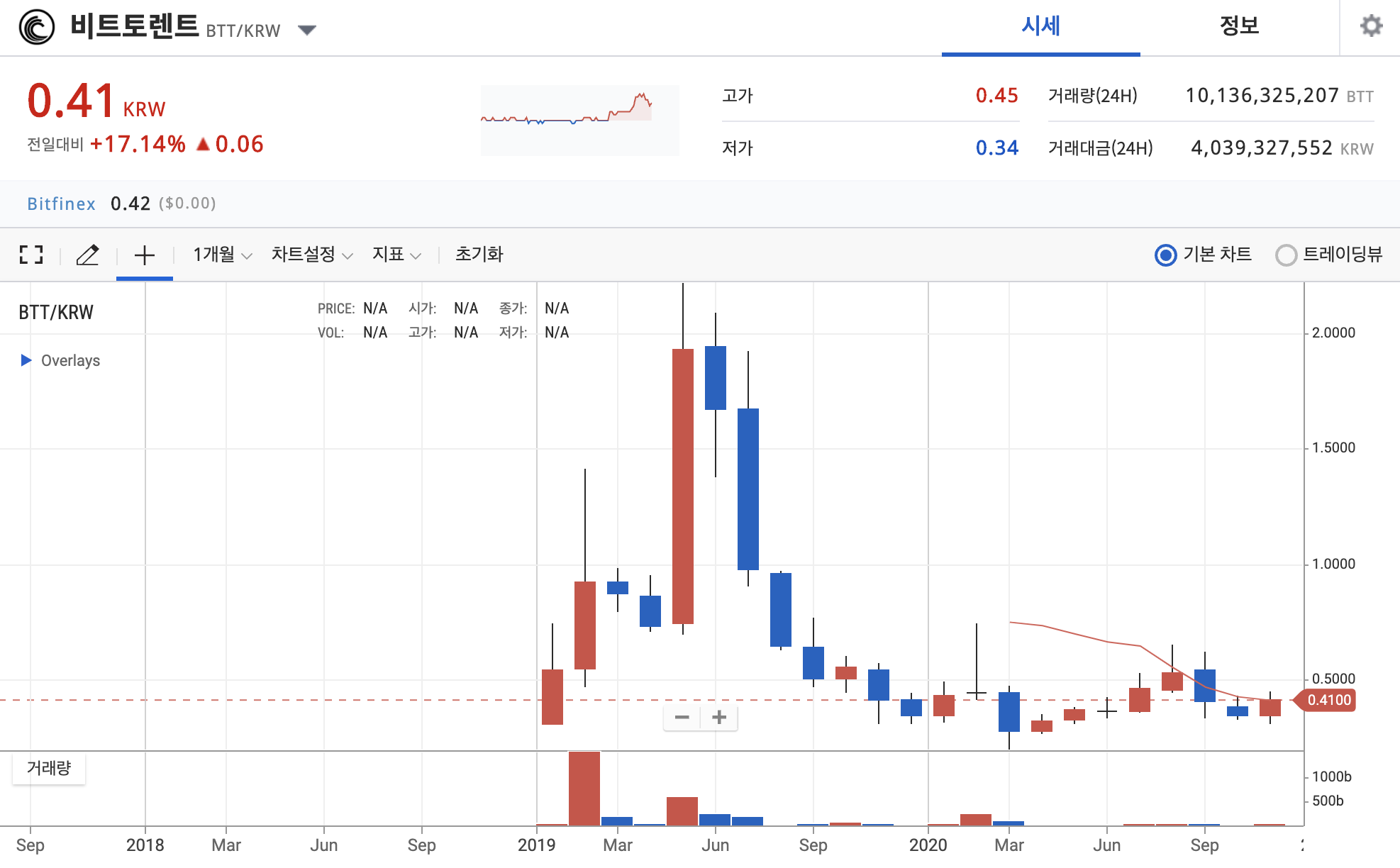 비트토렌트는 발행량이 많기 때문에 코인 가격 자체가 0.41원으로 가격 자체는 현재 굉장히 낮지만, 최고 2원 가까이 올라간 코인입니다. 현재 고점대비 1/4 코인 가격을 보이고 있는 추세입니다. 오늘 시세가 많이 뛰어서 17%정도 오른 가격이 0.41원이네요.