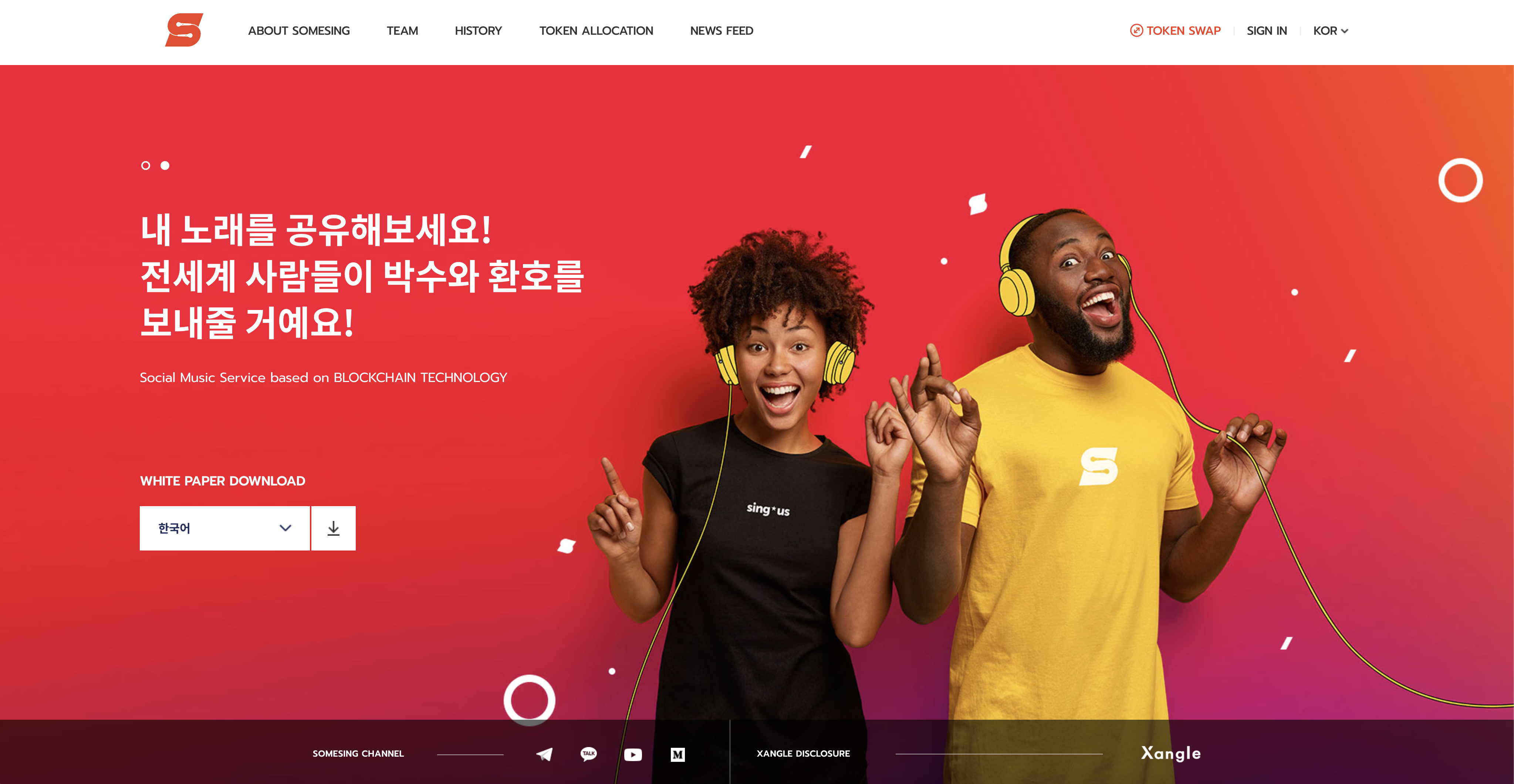 소셜 뮤직 서비스 SOMESING은 블록 체인 기술을 접목하여, 제작자는 누구나 좋아하는 곡을 즐기고 창작 활동에 대한 보상을 받을 수 있도록 고안된 플랫폼입니다. 노래를 좋아하는 사람이라면 누구나 썸씽 앱을 통해 연중 무휴 24시간 전곡을 무료로 부를 수 있습니다. 새로 만든 노래 콘텐츠에 대한 커뮤니티를 통한 선물, 지원, 이벤트를 통해 경제적 보상을 받을 수 있도록 짜여진 생태계입니다.