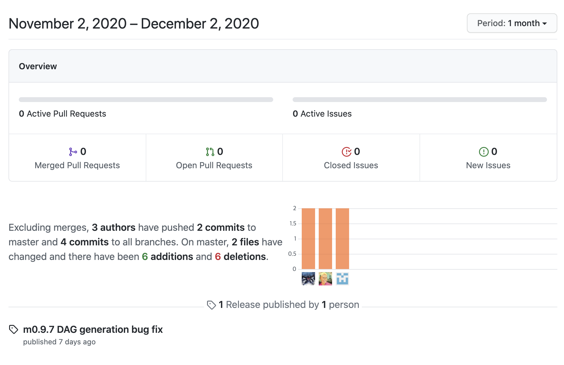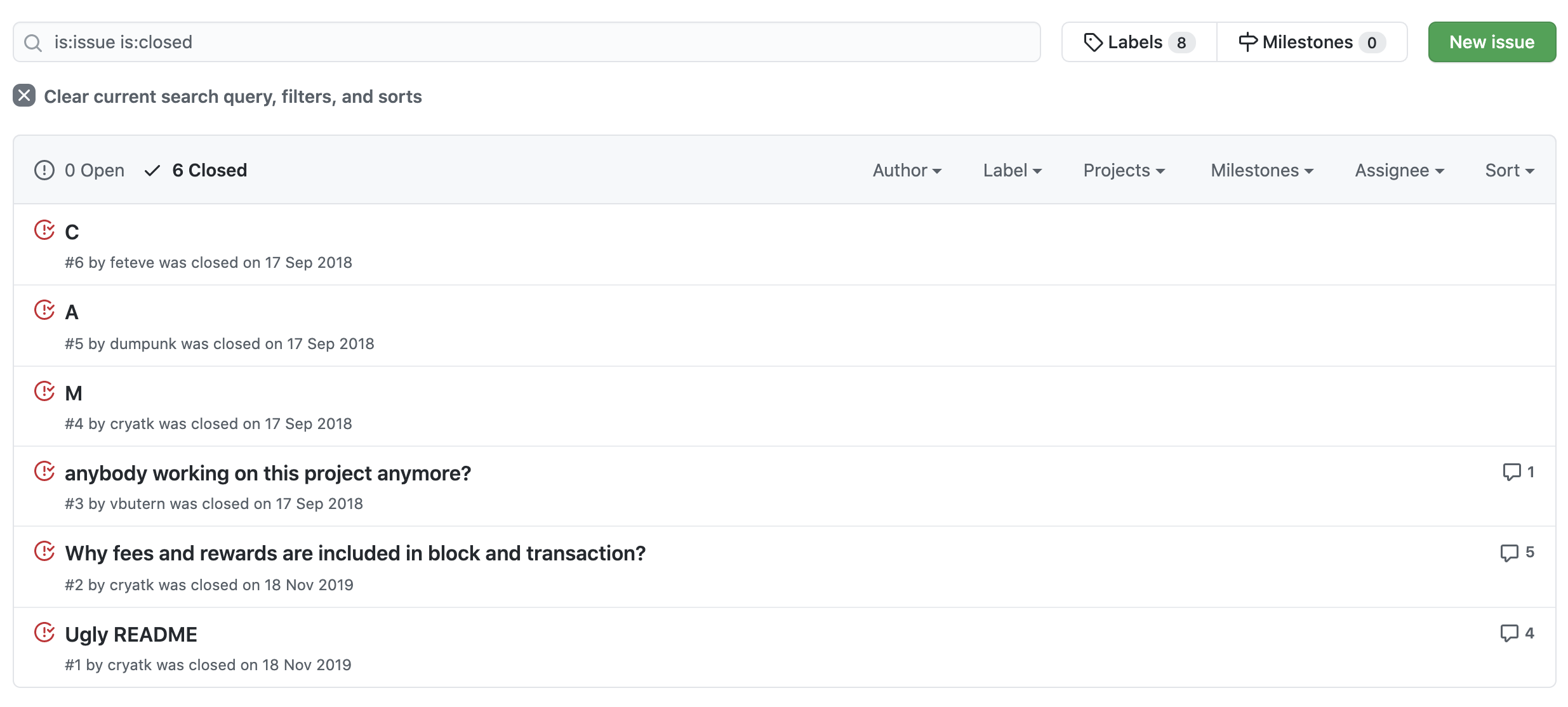 유의미한 커밋 목록이 존재하지 않아서 프로젝트를 검증할수가 없네요. 비공개 저장소에서 새로운 코인을 개발중인지, 아니면 코인 개발을 이제 하지 않는 것인지는 모르겠지만 현재 저장소들을 기준으로 살펴보면 코인 개발을 하지 않는 쪽이 좀 더 가능성이 높은 것 같습니다.