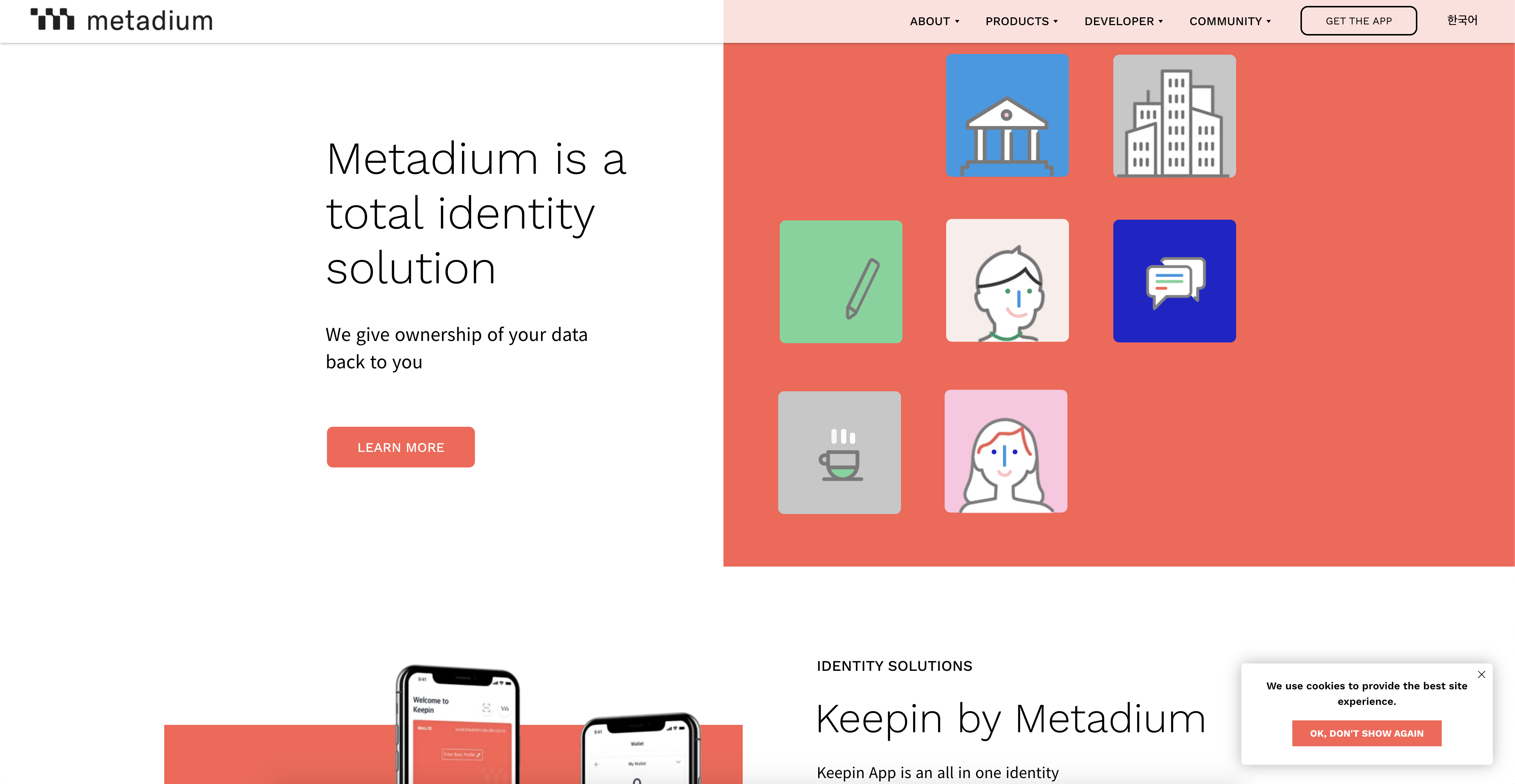 메타디움은 블록체인을 이용하여 탈중앙화된 신원인증 플랫폼을 구축합니다. 현재의 중앙화된 신원인증 체계에서는 개인정보의 소유권이 온전히 개인에게 있다고 보기 힘듭니다. 메타디움은 메타 ID(Meta ID)를 통해 사용자가 개인정보의 생성, 관리, 제공, 삭제 등에 있어 모든 권한을 가지게 하여 개인정보의 자기 소유권을 보장하고자 합니다.