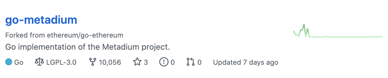 하지만 우리가 앞서 살펴봤듯이 메타디움 공식 깃허브 프로젝트에서 딱히 활성화된 프로젝트 목록들이 보이지 않았는데요. 심지어 메타디움 프로젝트에서 핵심처럼 보이는 go-metadium 프로젝트와 같은 경우에는 ethereum/go-ethereum 프로젝트를 포크떠서 개발을 진행하고 있었지만 최근 들어서 커밋, 이슈 관리와 같은 활동이 없는 것을 보면 이 프로젝트 또한 관리가 되지 않는 것처럼 보입니다.