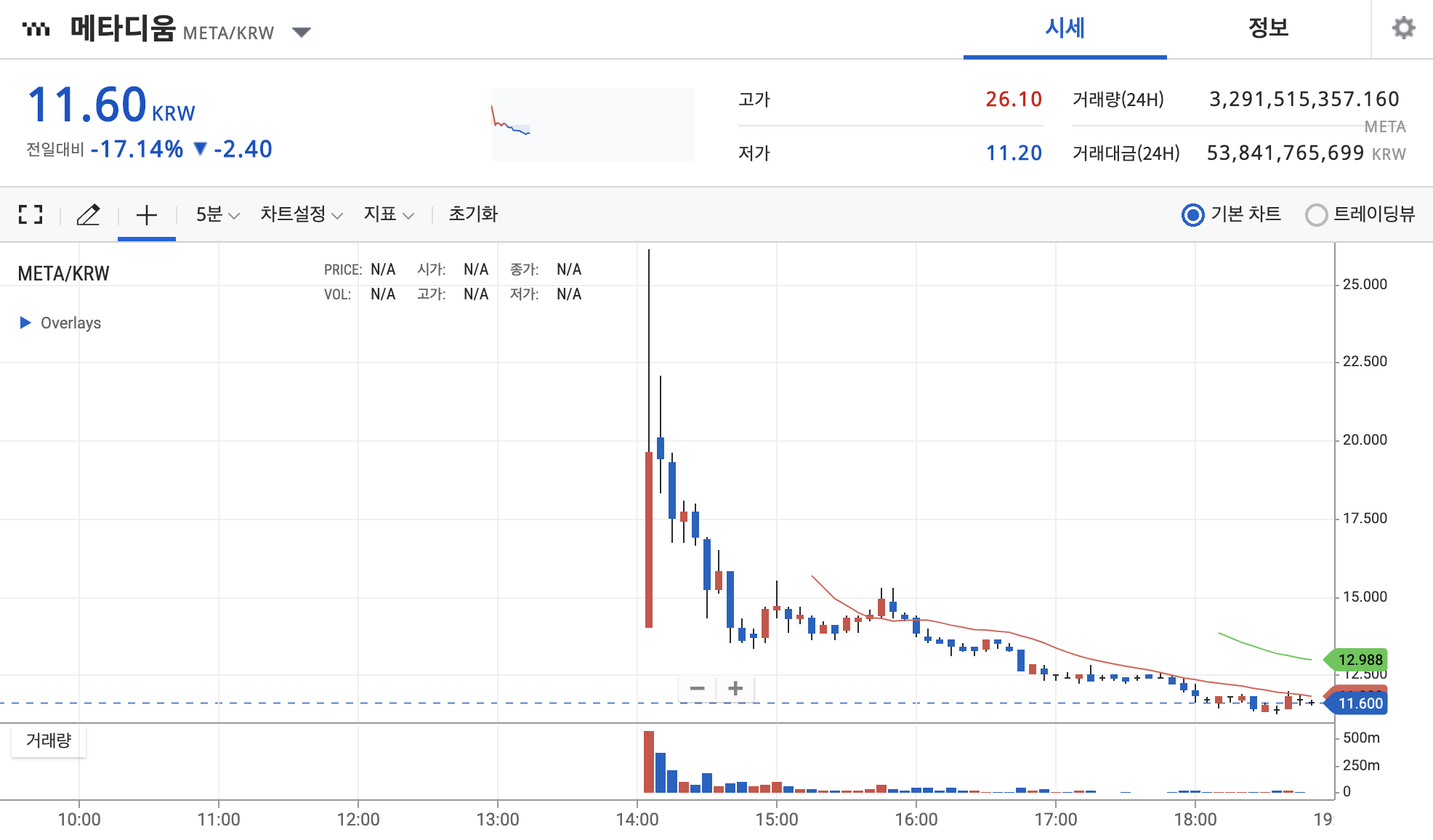 메타디움 코인은 2020년 12월 2일 오후 14시에 업비트에 상장한 후 현재까지 우하향하고 있는 모습을 보여주고 있습니다. 25원 근처까지 도달했다가 급락하고 현재 11원정도의 시세로 거래되고 있는 것을 확인할 수 있습니다. 역시 상장 코인을 매수하는 것은 정말 도박을 하는 것과 같다고 생각합니다. 초고점에 물릴수도 있으니 이런 급등 코인은 조심하는 것이 좋습니다.