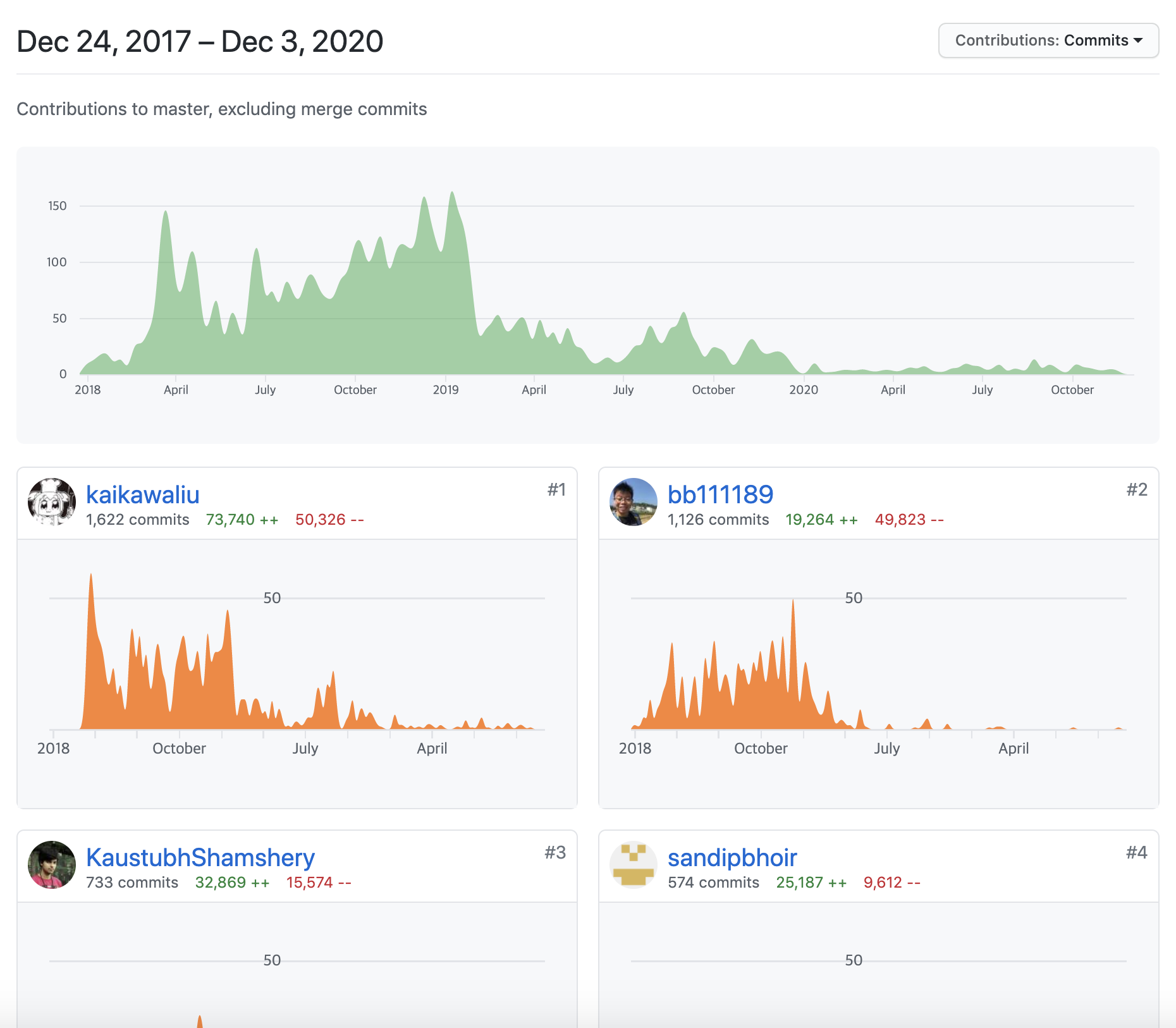 질리카는 8,802회 커밋이 이뤄졌지만 오에스티는 24회밖에 커밋이 없네요. 이처럼 개발자들의 개발 참여도를 커밋이라는 횟수로 어느정도 판단이 가능합니다.