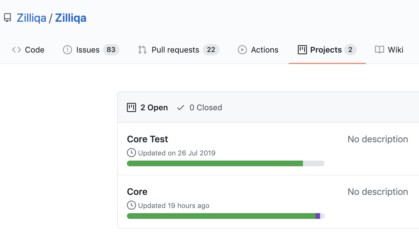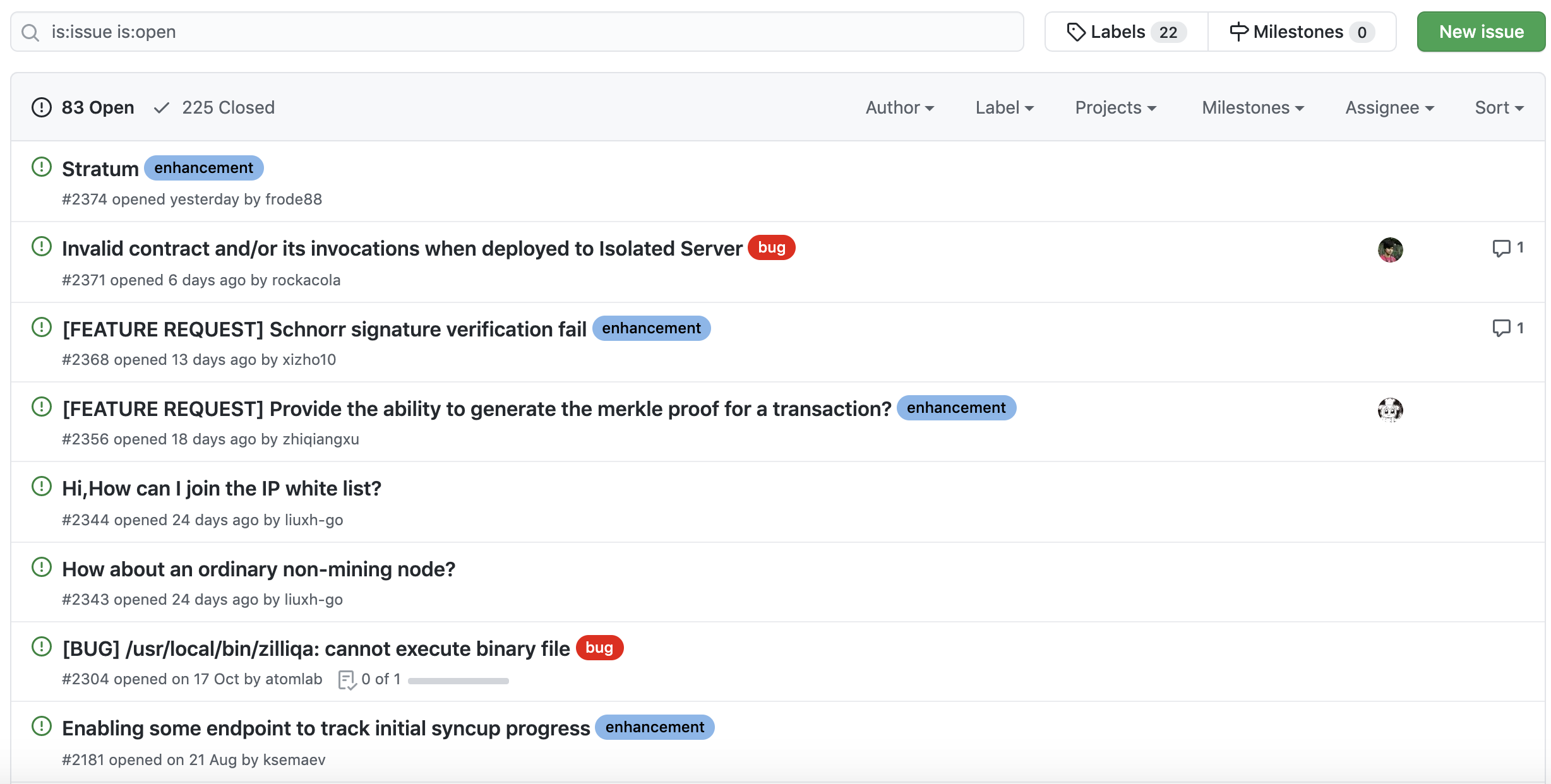 아래 질리카 코인 이슈 현황을 살펴보면 83개의 이슈가 열려있고, 225개의 이슈가 해결되어 Closed가 된 것을 확인할 수 있습니다. 프로젝트가 굉장히 활발히 진행되고 있다는 점 보이시나요? 반면에 오에스티 코인 저장소의 이슈는 존재하지 않습니다.