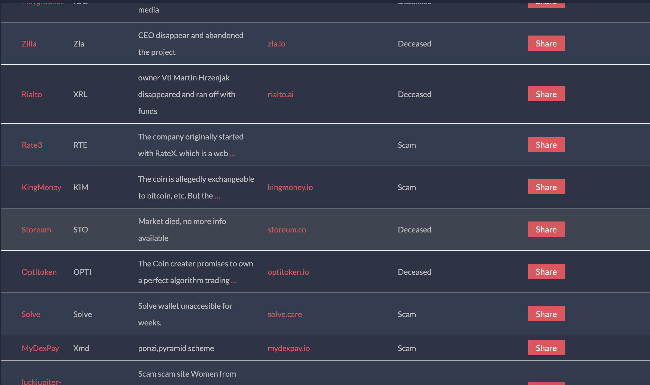 사기거나 개발이 중단된 코인 프로젝트들이 목록화 되어있습니다. 현재도 굉장히 많은 코인들이 올라가 있는 것을 알 수 있는데요. 정말 사기가 판치는 코인판이라는 생각이 드네요. 이런 스캠코인 때문에 많은 투자자들이 굉장히 많은 피해를 입고 있습니다.