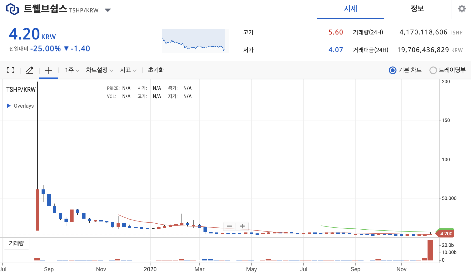 트웰브쉽스 코인은 상장 초 200원 가까이 하던 가격이 현재 4.2원으로 거의 50토막 이상 난 것으로 보이네요.