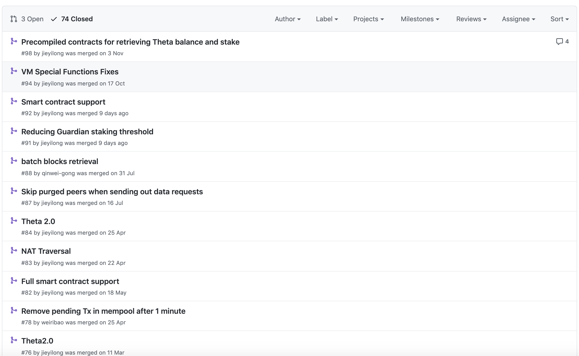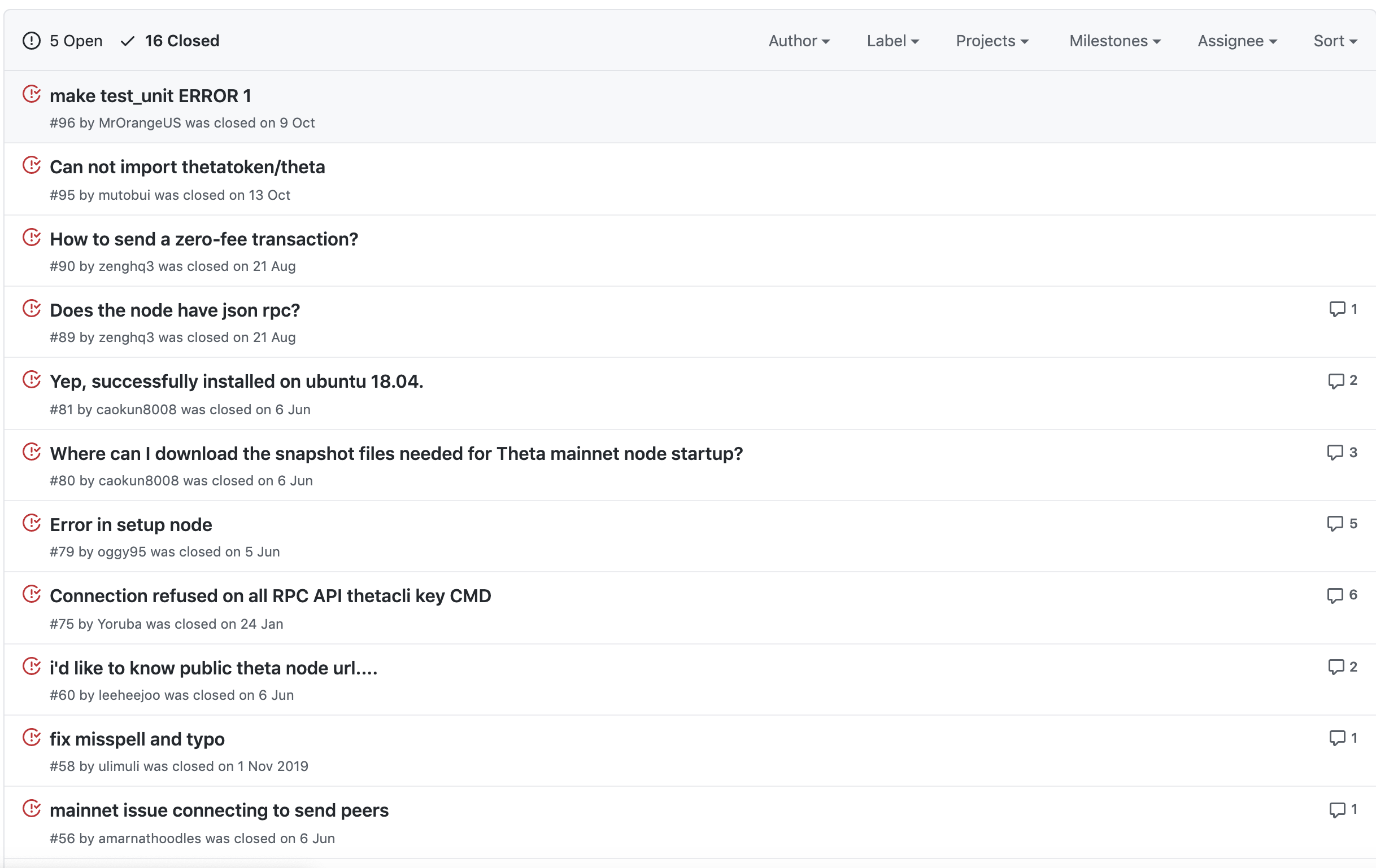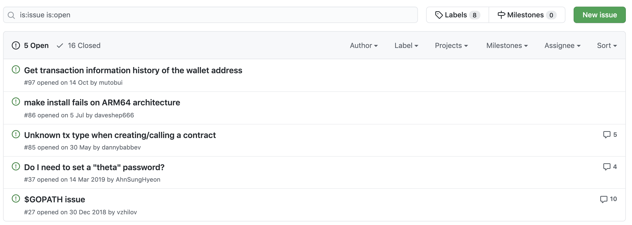 이슈도 몇개 있기는 하지만 그래도 2년정도된 프로젝트에서 이정도 이슈 개수는 조금 아쉽기는 합니다. 클로즈된 이슈는 16건 그리고 현재 오픈되어 있는 이슈는 6건입니다. 이전에 질리카 코인 프로젝트에서 이슈 관리를 하는 모습을 보셨을 것입니다. 그에 비하면 이정도는 이슈를 잘 사용하지 않은 수준이지만 아예 이슈를 사용하지 않는 프로젝트도 대다수기 때문에 그에 비하면 이정도는 굉장히 양반입니다.