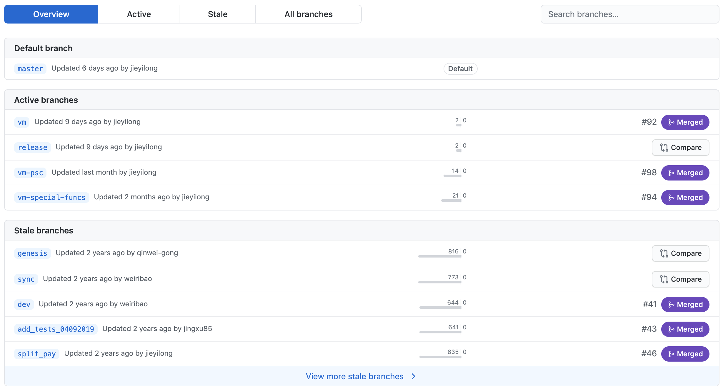 브랜치 관리를 하는 것도 협업하는데 있어서 굉장히 중요한 부분 중 하나입니다. 해당 프로젝트에서 활성화된 브랜치들을 확인해보면 기능별로 브랜치 관리를 잘 진행한 것을 확인할 수 있습니다.