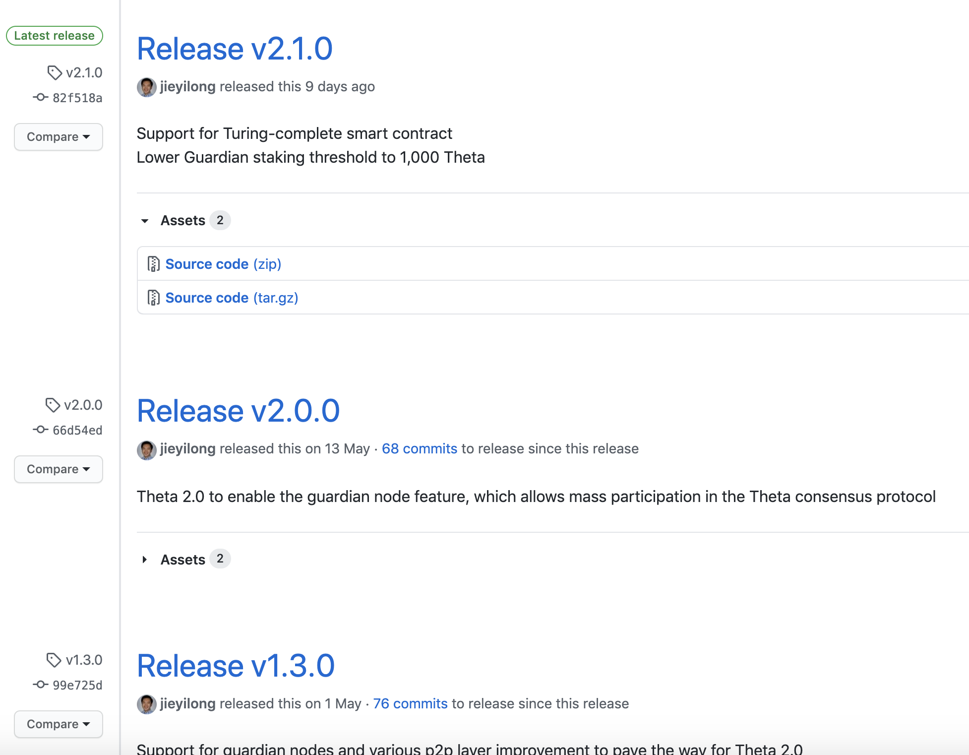 태그는 배포하기 전에 버전을 적는 과정입니다. 버전을 올린 후 릴리즈를 진행하는게 기본적인 배포 단계입니다. 해당 프로젝트 버전관리는 잘되고 있는 편입니다. 이렇게 태그와 릴리즈 관리가 되어있는 프로젝트가 사실 당연한건데 코인 관련 프로젝트에 이렇게 기본적인 부분들이 지켜지지 않는 프로젝트가 굉장히 많은 것을 알 수 있습니다.