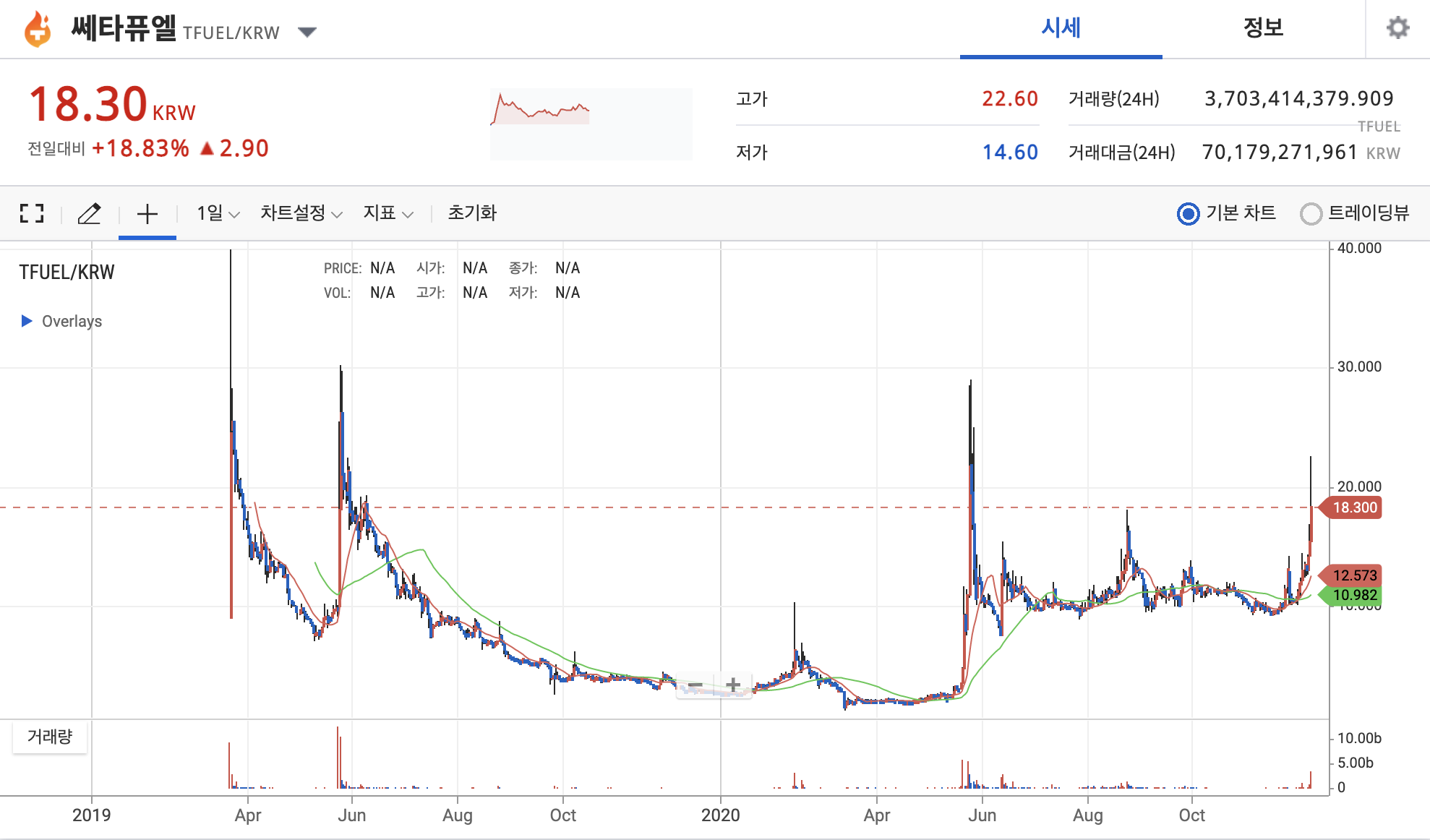 트웰브쉽스(50토막)과 같은 코인들과 비교하면 나름 양호한 수준입니다. 고점(40원)대비 현재 18.30원을 기록하고 있습니다.