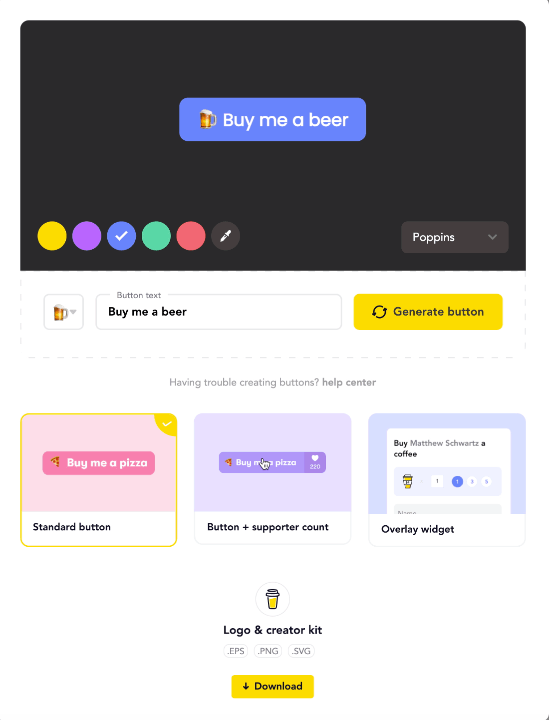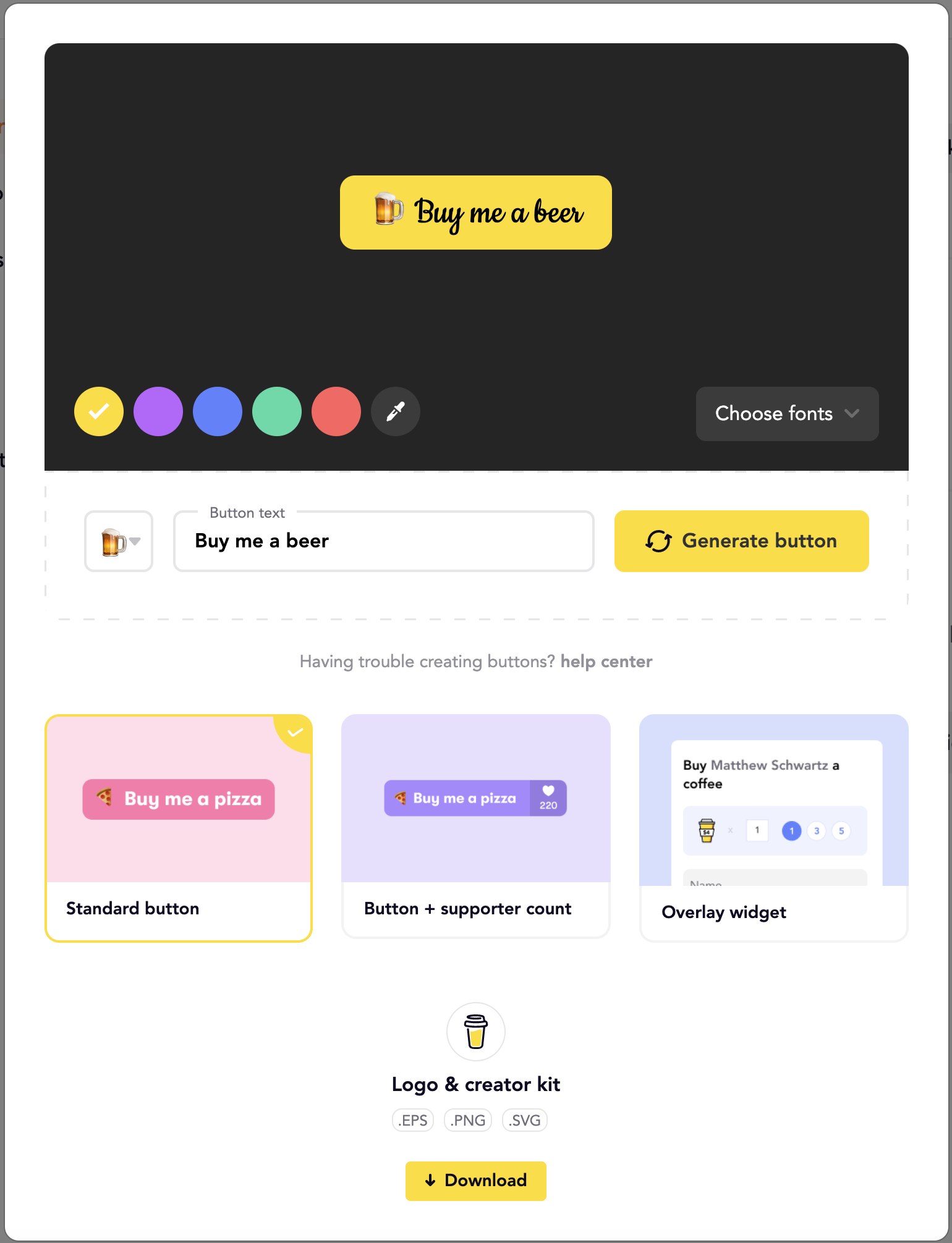 Generate button 버튼을 누르면 아래와 같은 팝업이 등장합니다. 아래 팝업 내에서 버튼의 디자인(색상과 폰트) 그리고 버튼 텍스트를 자신의 블로그 스타일과 비슷하게 맞출 수 있습니다. Standard button 경우 스크립트로 코드를 가져오기 때문에 Button + supporter count를 통해서 a태그로 코드를 가져오도록 하겠습니다.