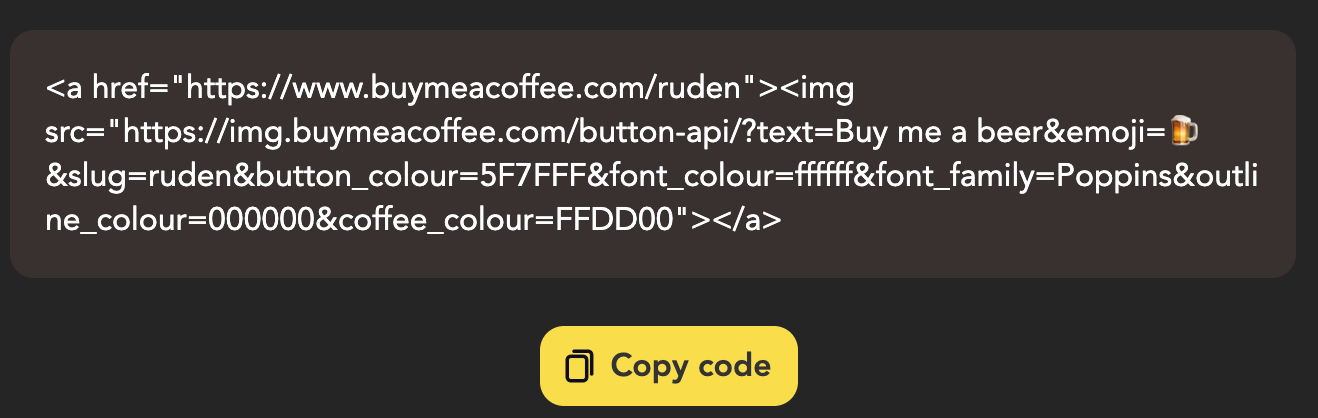 스타일을 조정하고 가운데 Generate button 버튼을 눌러줍니다. 그러면 아래처럼 a태그를 카피할 수 있게 코드가 생성되게 됩니다. Copy code를 눌러서 코드를 복사합니다.