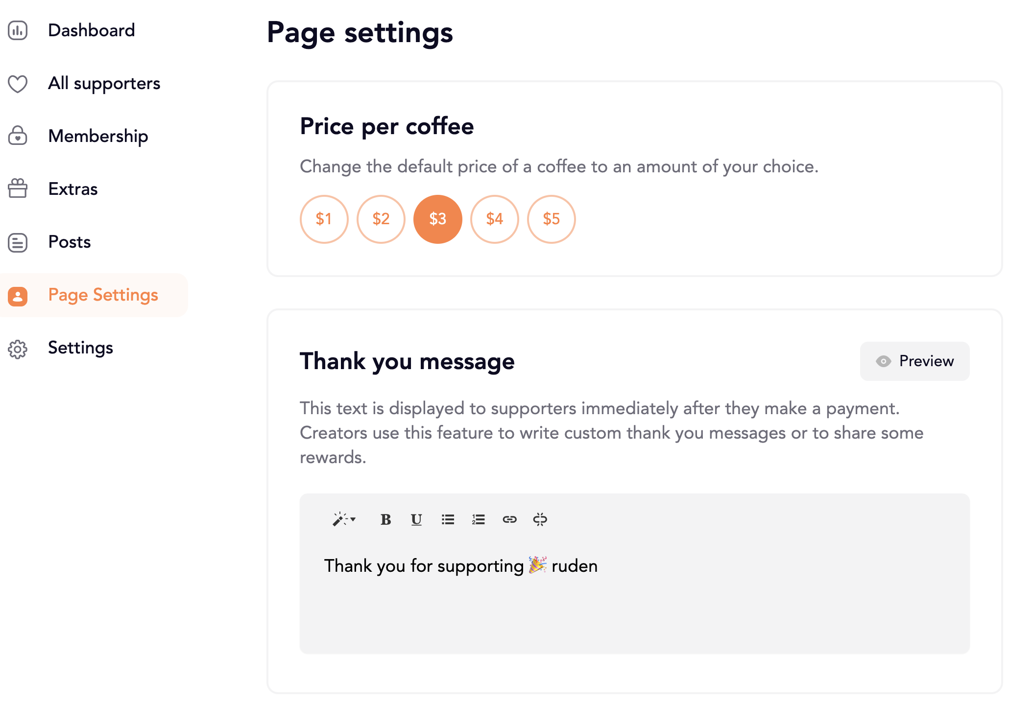 도네이션을 받기 위한 금액 또한 수정할 수 있습니다. 개인적으로 3달러 정도 금액이 적당한 수준이라고 생각하여 저는 3달러로 세팅해놨습니다. 그리고 감사 메시지도 커스터마이징 할 수 있습니다. 원하는 감사 메시지를 작성해주세요.