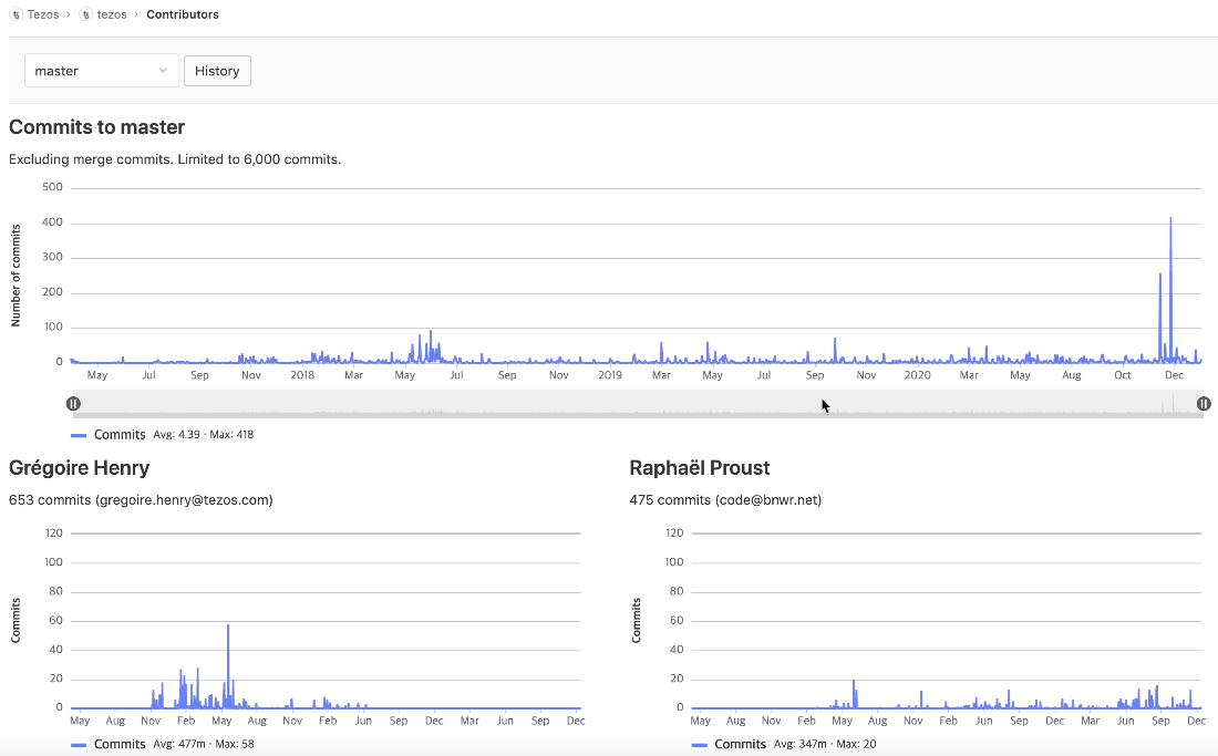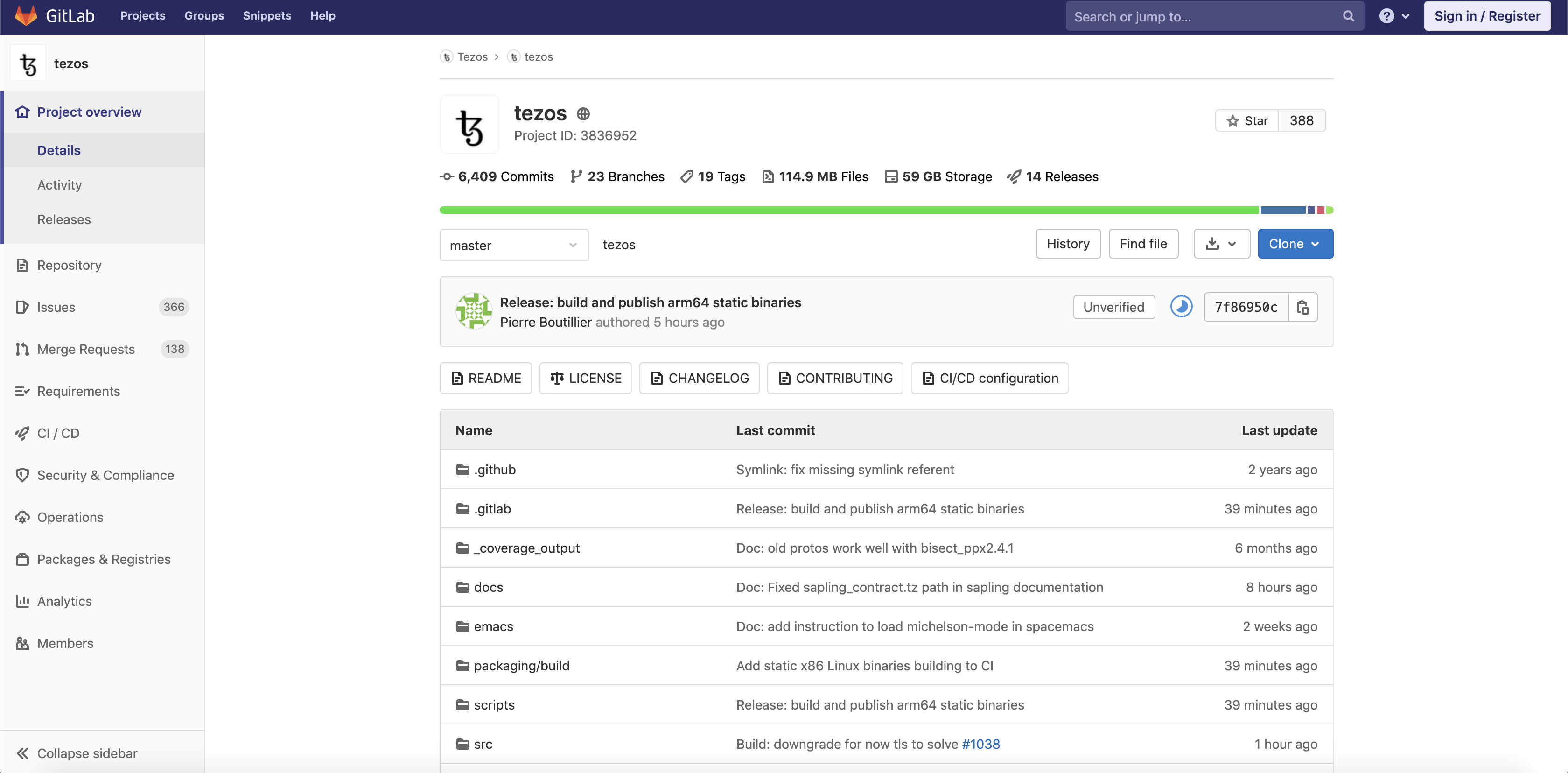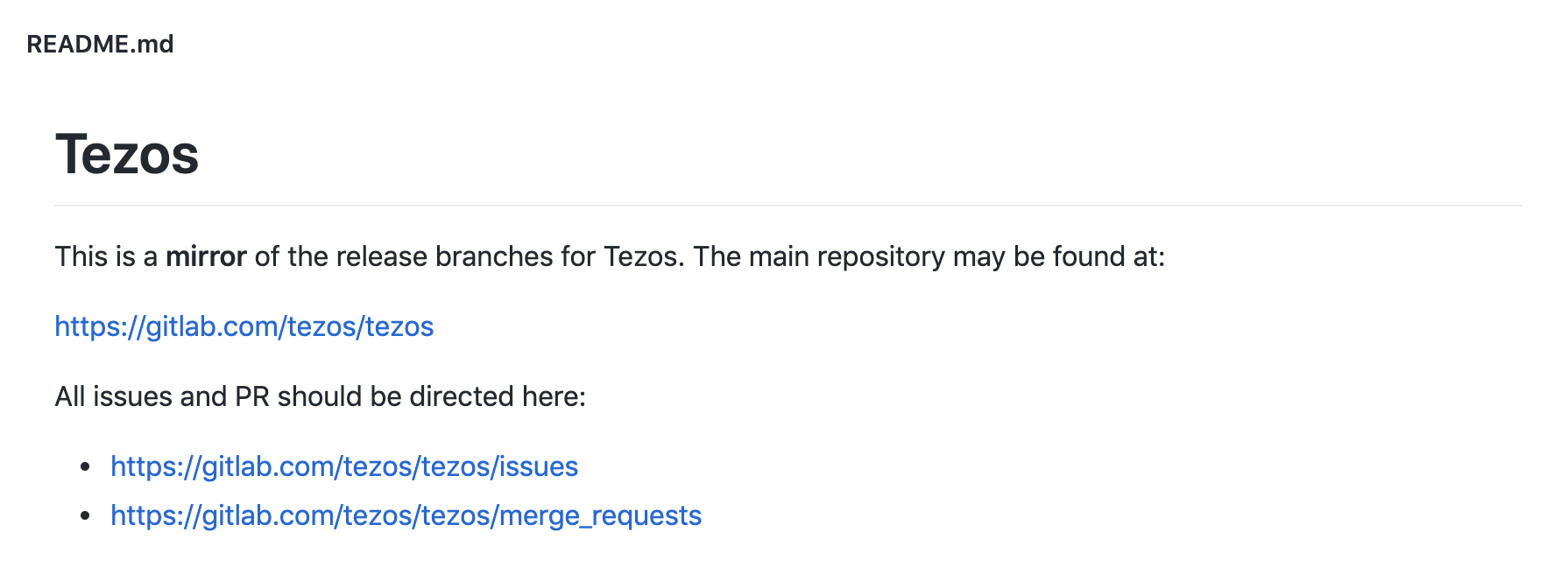 아마 다른 버전 관리 시스템에서 작업한 결과물을 깃허브에 공개하는 식으로 깃허브를 관리하는 것 같습니다. 테조스 메인 프로젝트는 깃랩(Gitlab)에서 관리되고 있었음을 아래 README 문서를 확인하면 알 수 있습니다.
