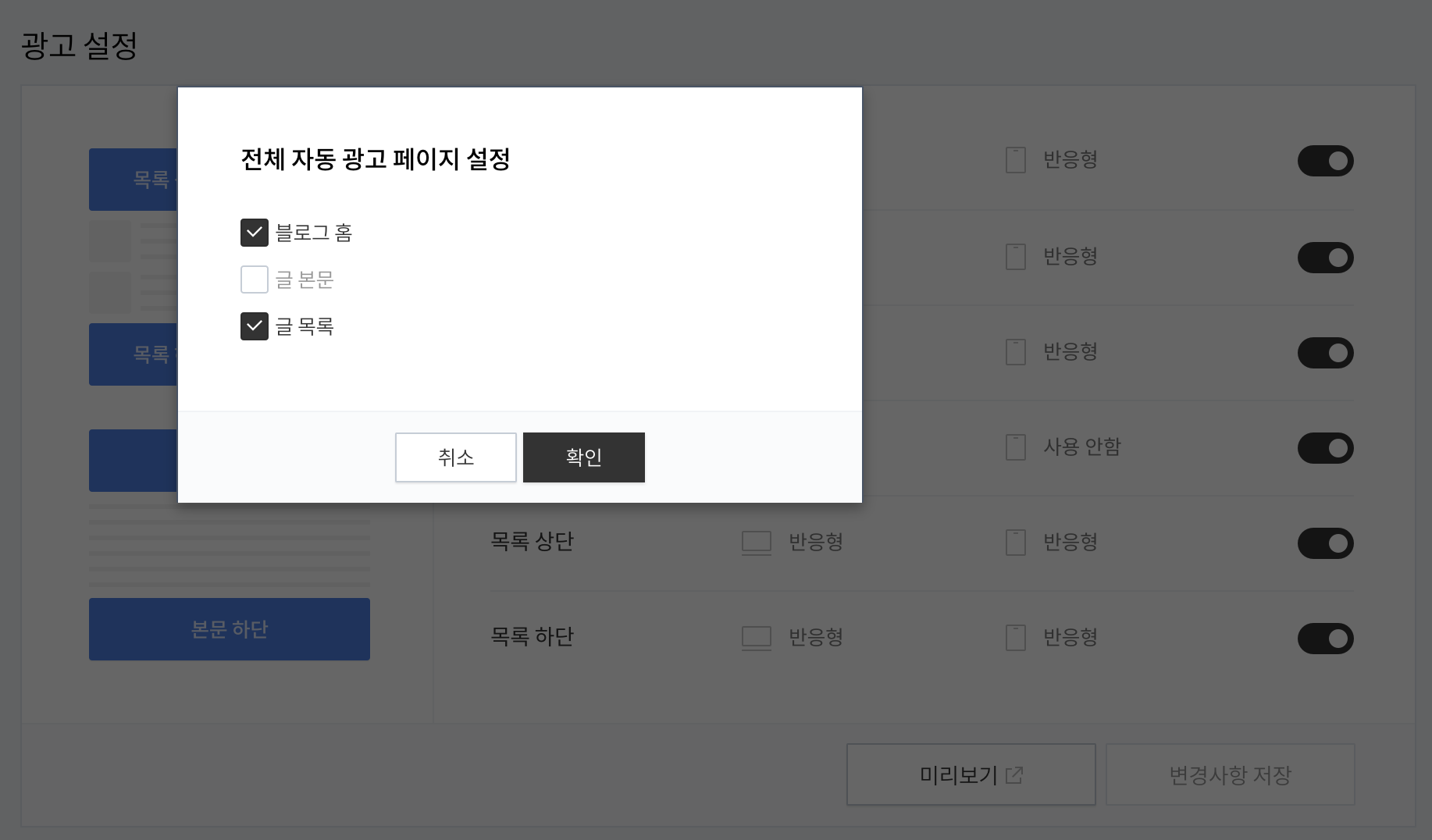 하지만 저는 이러한 광고 배치 + 자동광고 배치로 광고를 노출하는 전략은 조금 비효율적인 방식이라고 생각했습니다. 그래서 실험적으로 배치해본 것이 애드센스 광고 설정에 전체 자동 광고 페이지 설정에 글 본문을 제외하고, 글 본문 페이지에는 제가 커스터마이징한 애드센스 삽입 코드를 넣도록 구현했습니다.