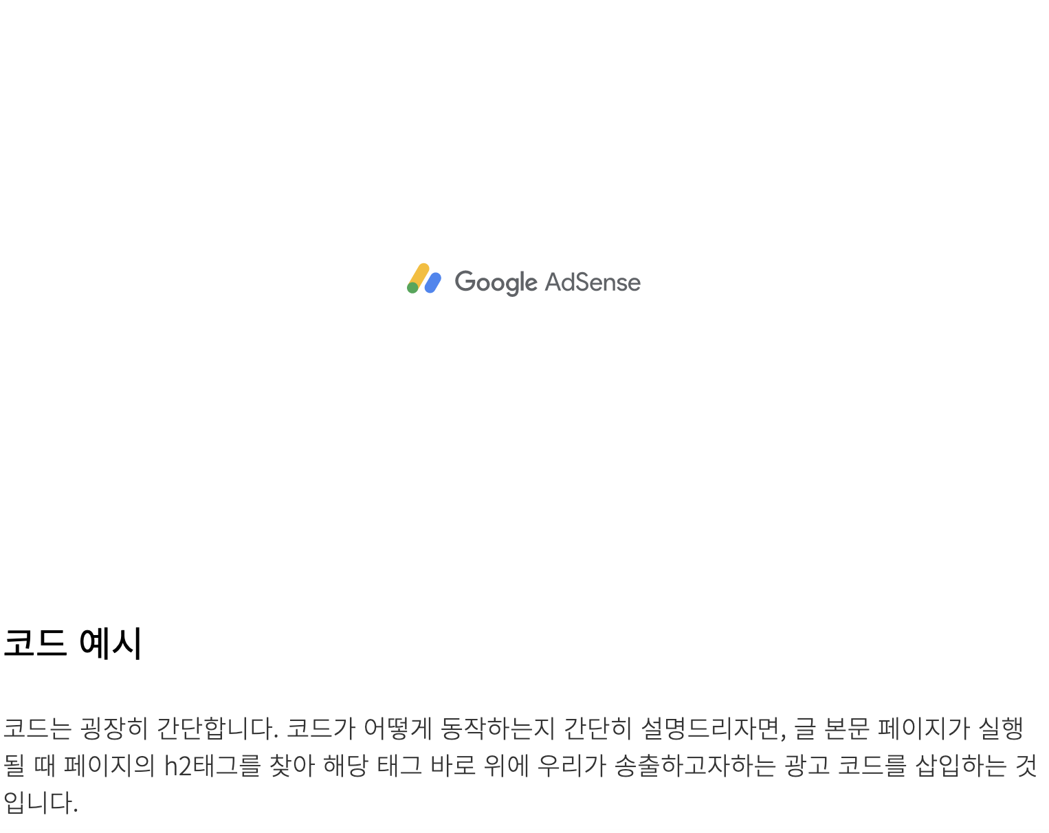 구현한 코드는 굉장히 간단합니다. 코드가 어떻게 동작하는지 간단히 설명드리자면, 글 본문 페이지가 실행될 때 페이지의 h2태그를 찾아 해당 태그 바로 위에 우리가 송출하고자하는 광고 코드를 삽입하는 것입니다.