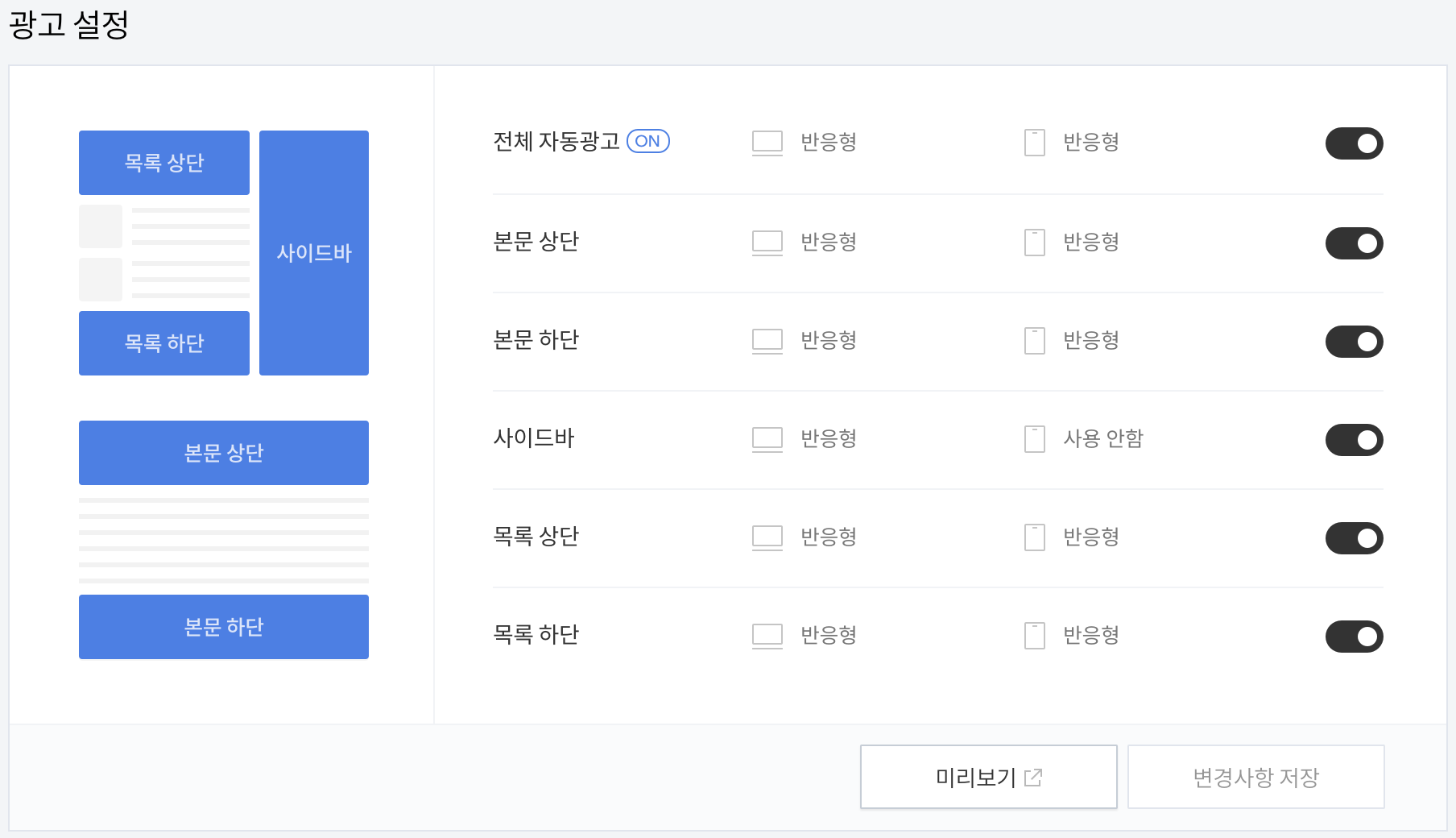 블로그 콘텐츠 목록 상단과 목록 하단 그리고 사이드바에 배치하는 것은 굉장히 효율적인 광고 배치입니다. 티스토리에서 수익 관련해서 이러한 기능을 제공하지 않았을 때 사용자들이 애드센스 광고를 DIY로 추가하는데 어려움이 있었으나 최근에는 굉장히 쉽게 추가할 수 있게 되었죠.