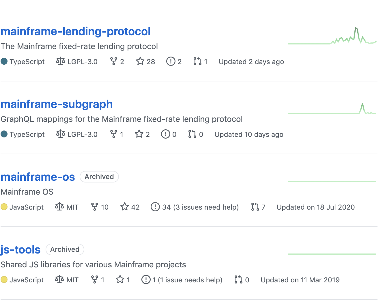메인프레임 코인 오픈소스들을 살펴보면 mainframe-lending-protocol, mainframe-subgraph 2개 프로젝트를 제외하면 2020년에도 제대로 개발이 진행되지않은 프로젝트로 보입니다. 활발하게 개발이 진행되고 있지는 않네요. (물론 Gitlab, Bitbucket, Github private으로 비공개로 프로젝트를 관리할 수 있겠지만, 코인을 개발하는 개발진들이 오픈소스로 공개하는데는 다 이유가 있지 않을까요? 오픈소스로 코인 개발 현황을 공개하는 개발팀들이 바보라서 공개하는 것도 아닐 것이구요)