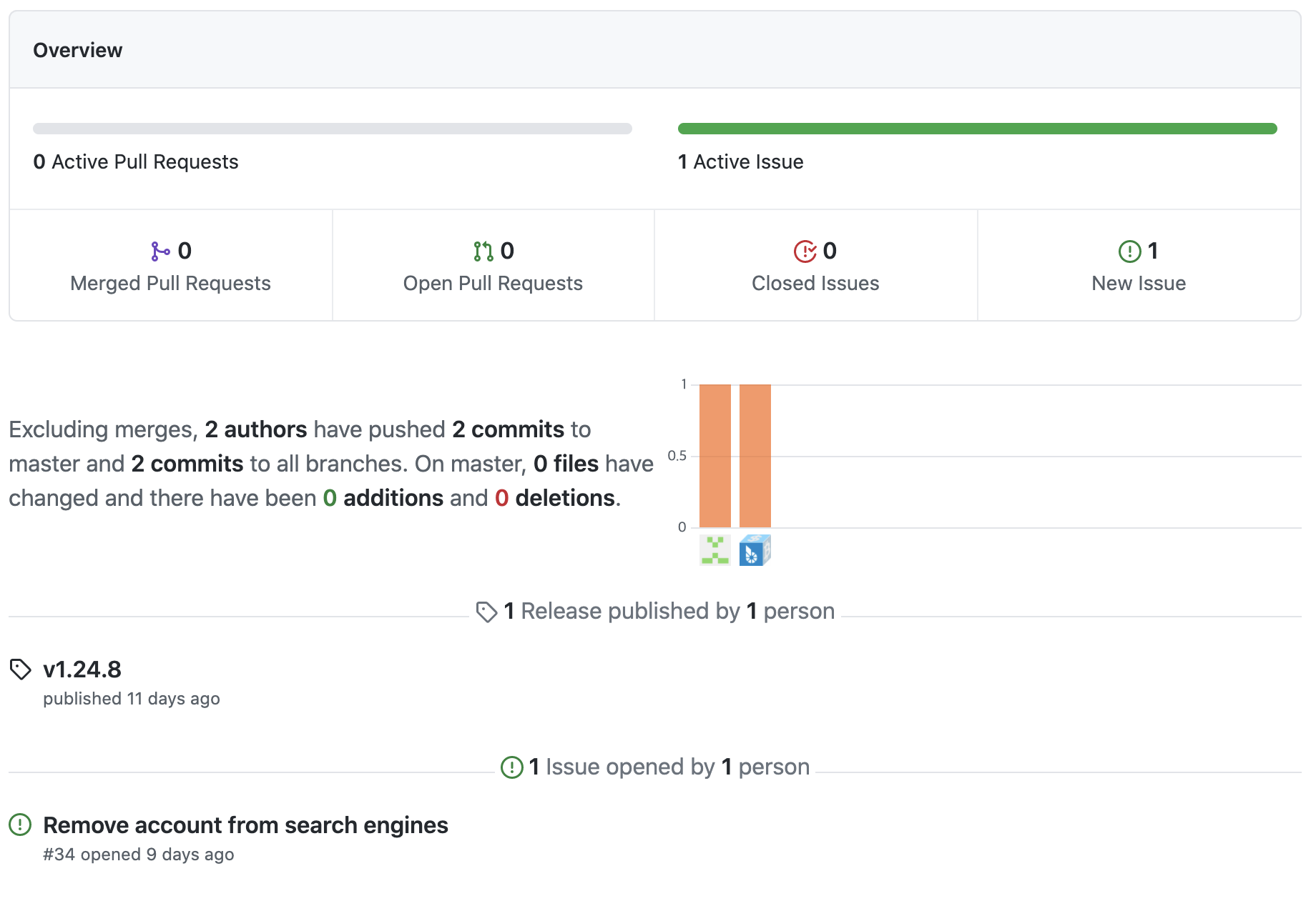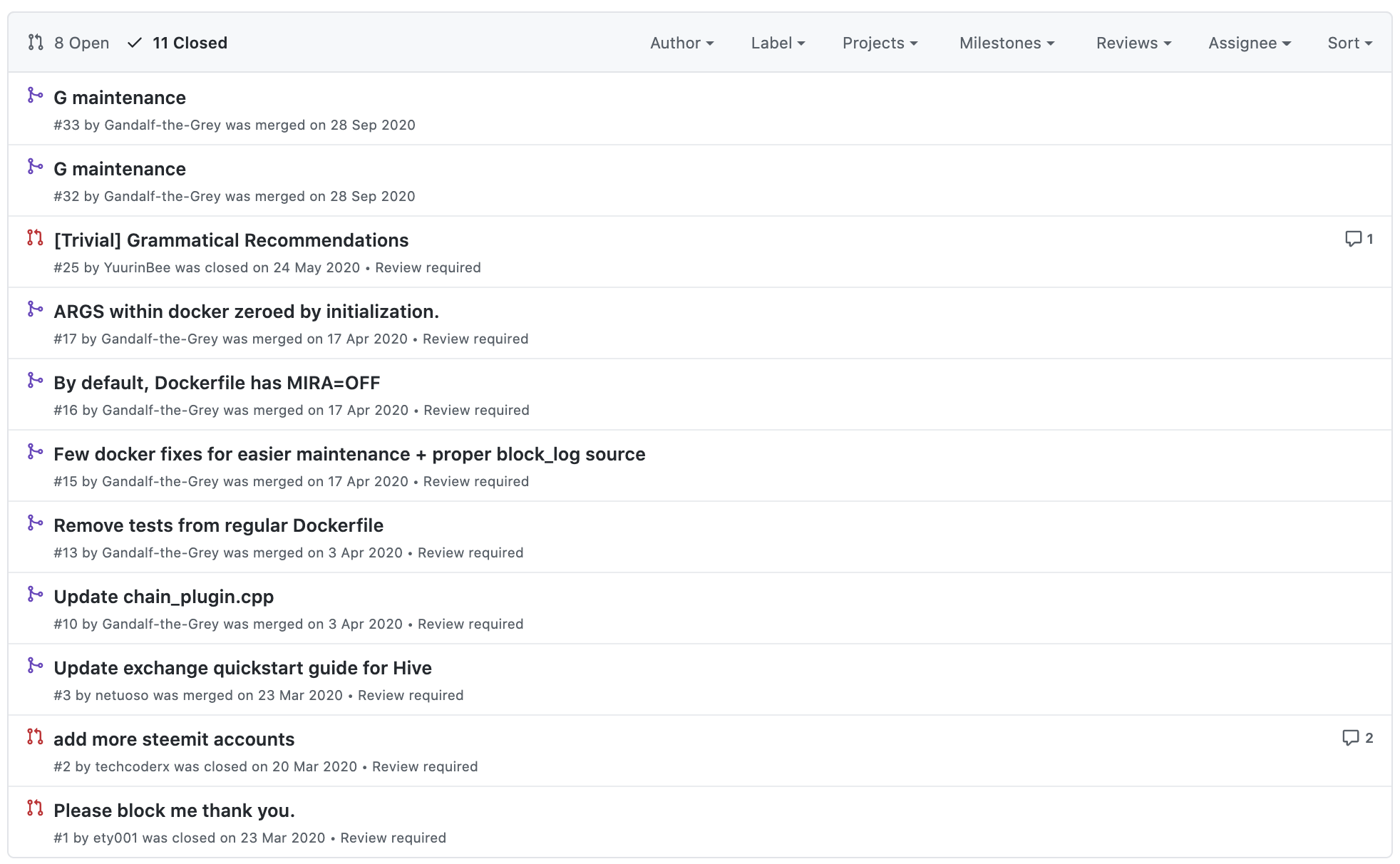 현재 프로젝트에서 열려있는 PR은 8건이고, 종료된 PR은 11건입니다. 굉장히 오래전부터 개발된 프로젝트라는 점을 감안하면 굉장히 PR 횟수가 저조한 것을 확인할 수 있습니다.