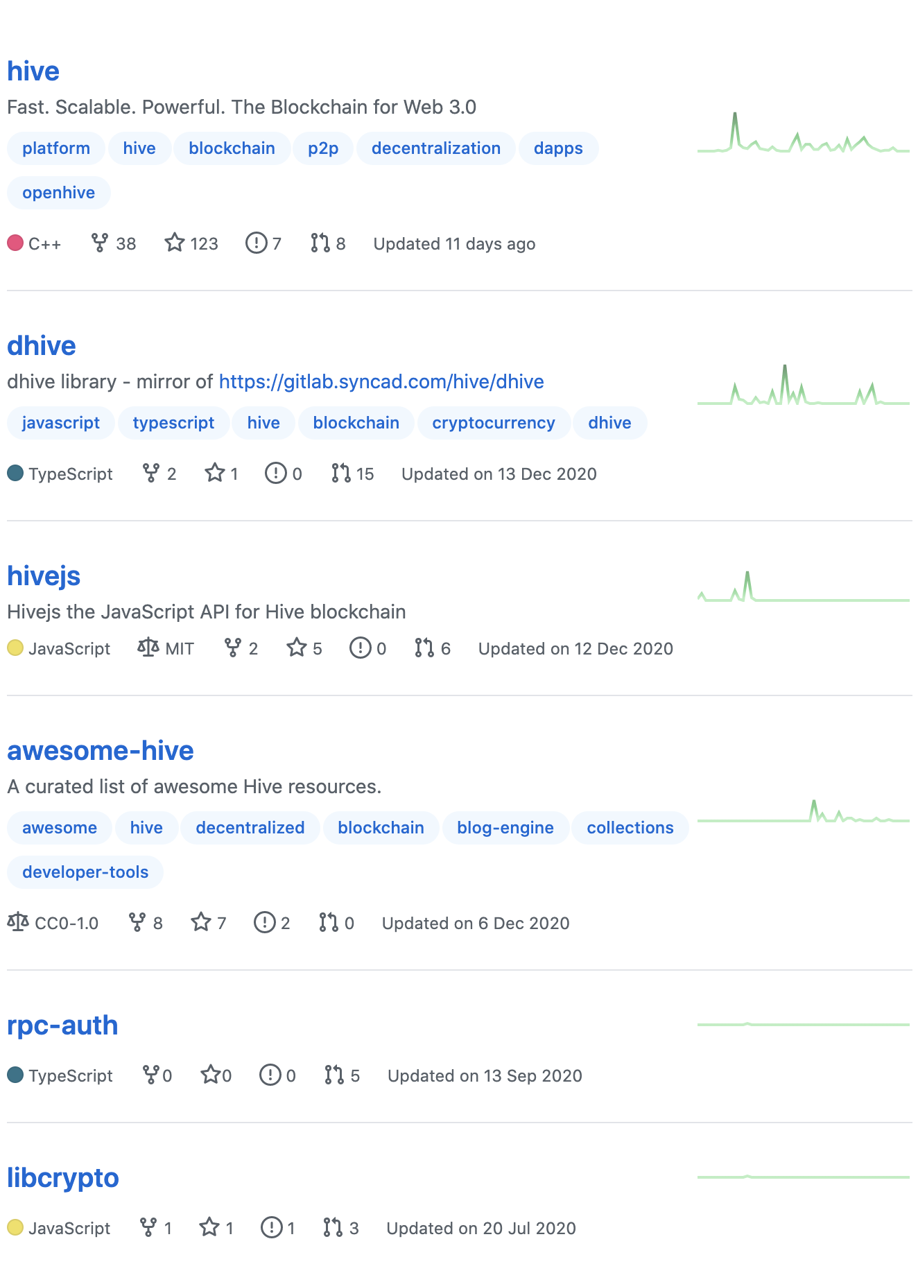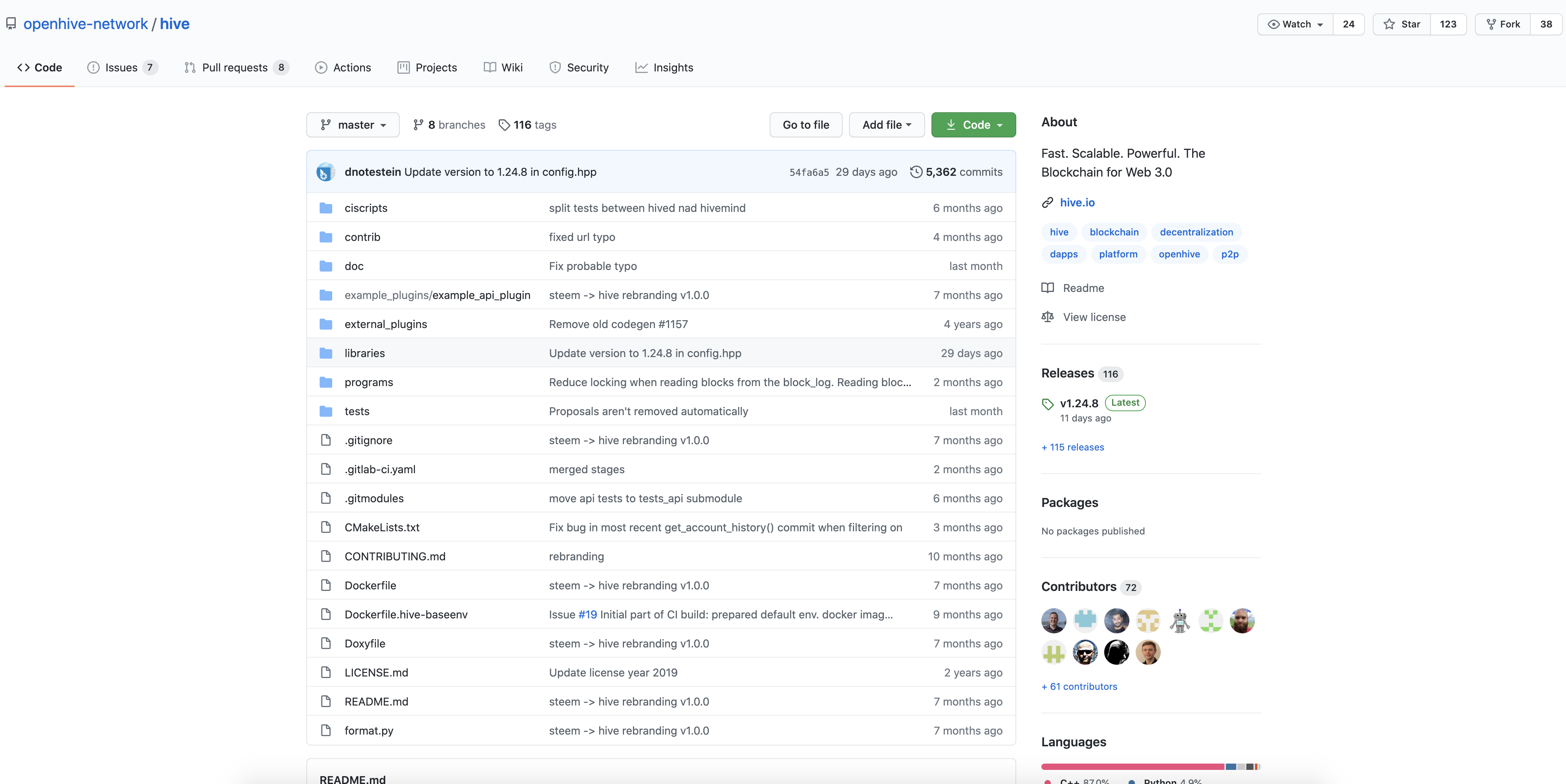 하이브(HIVE) 코인 개발 현황을 한번 살펴보도록 하겠습니다. 하이브 코인의 깃허브 프로젝트는 아래 링크에서 확인할 수 있습니다.(하이브 공식홈페이지에서 깃허브 오픈소스 프로젝트 링크를 연동해놓은 만큼 개발을 잘 진행하고 있는지 기대가 됩니다.)
