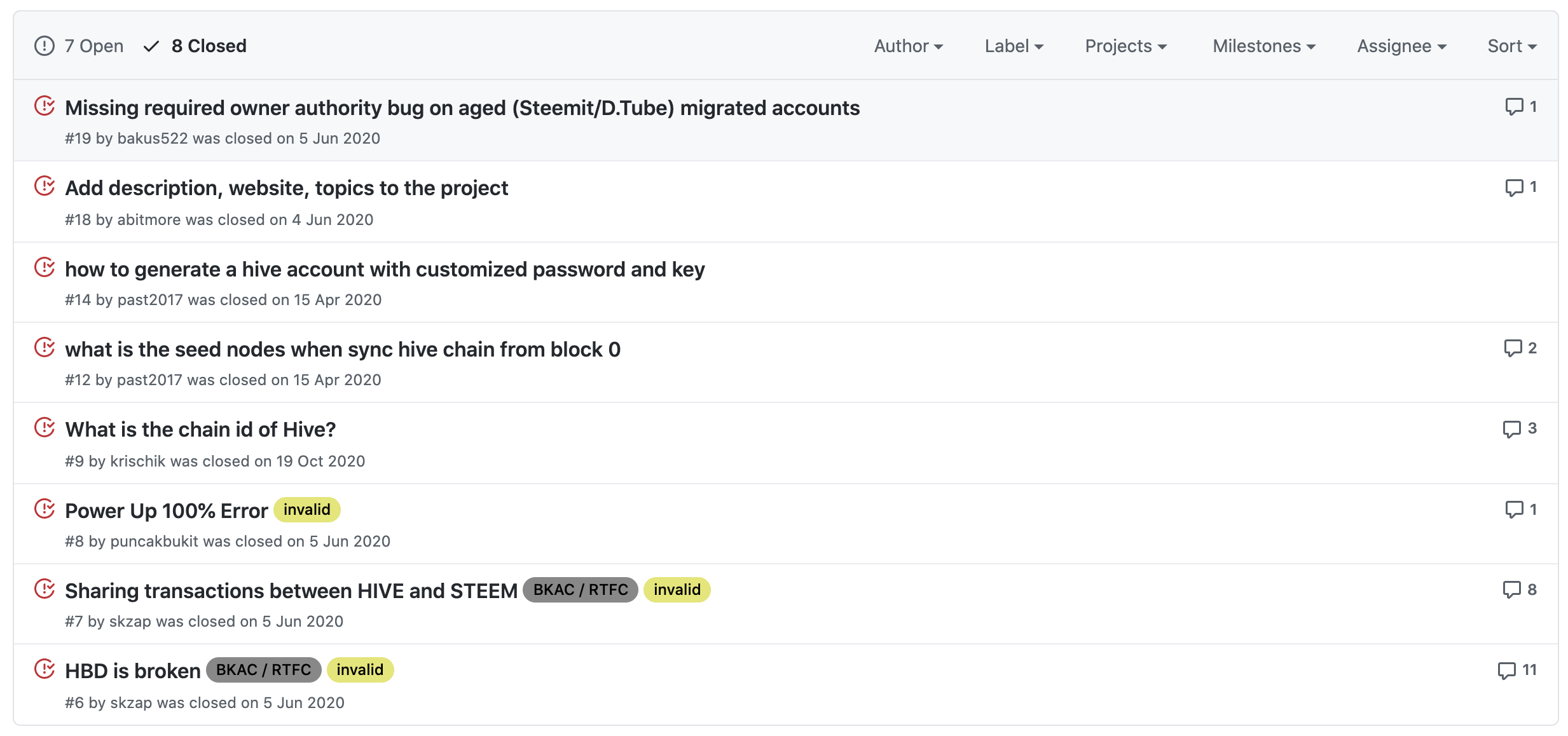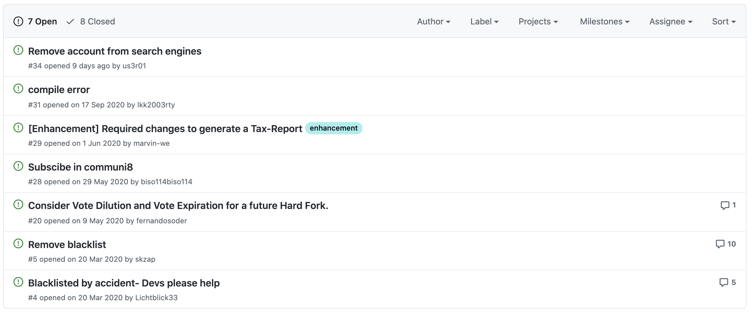 프로젝트에서 가장 중요한 부분은 개인적으로 버그나 개선사항이 생겼을 때 이슈를 작성하고 관리하는 것이라고 생각합니다. 이슈를 활용해서 프로젝트에서 발생되는 모든 문제들을 관리할 수 있습니다. 프로젝트에서 이슈들까지 제대로 관리하고 있다면 해당 코인을 개발하는 개발진들의 개발 참여도는 굉장히 긍정적으로 보인다고 말씀드리고 싶습니다.