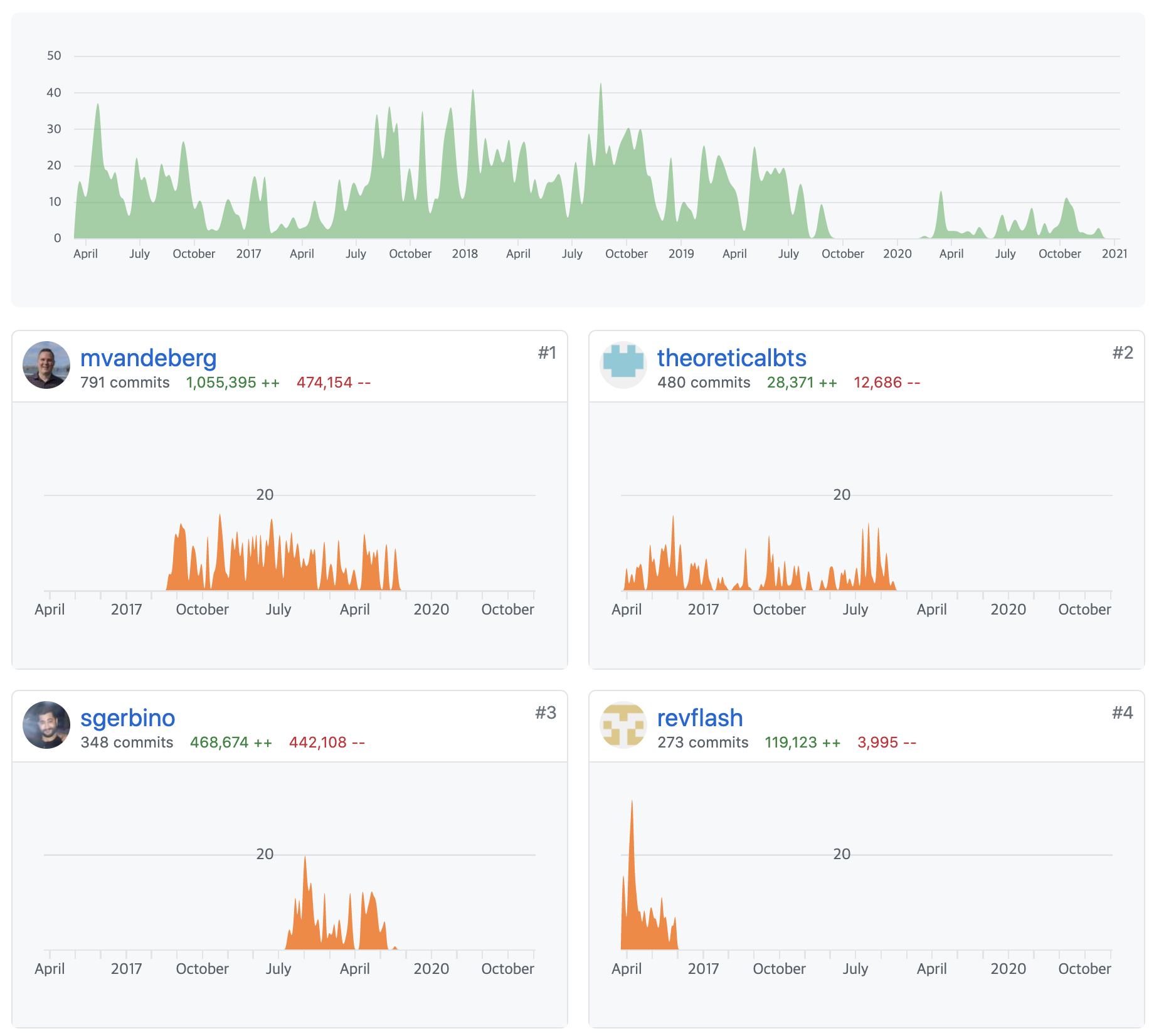 프로젝트 내에서 참여자들이 프로젝트 코드를 수정한 후 메시지를 남긴 개수입니다. 커밋 메시지들이 작성된 일자를 살펴보면 업데이트가 빈번하게 이뤄지지는 않는 다는 것을 확인할 수 있습니다.(가장 최근에 마스터 브랜치에 커밋된 이력이 29일 전이니 업데이트가 빈번한 편은 아닌 것을 확인할 수 있죠.) 현재까지 프로젝트에 남겨진 커밋수는 5,362개로 2016년 5월 13일부터 진행된 프로젝트임을 감안하면 일반적인 커밋수라고 볼 수 있습니다. (기준: 1일 1커밋)