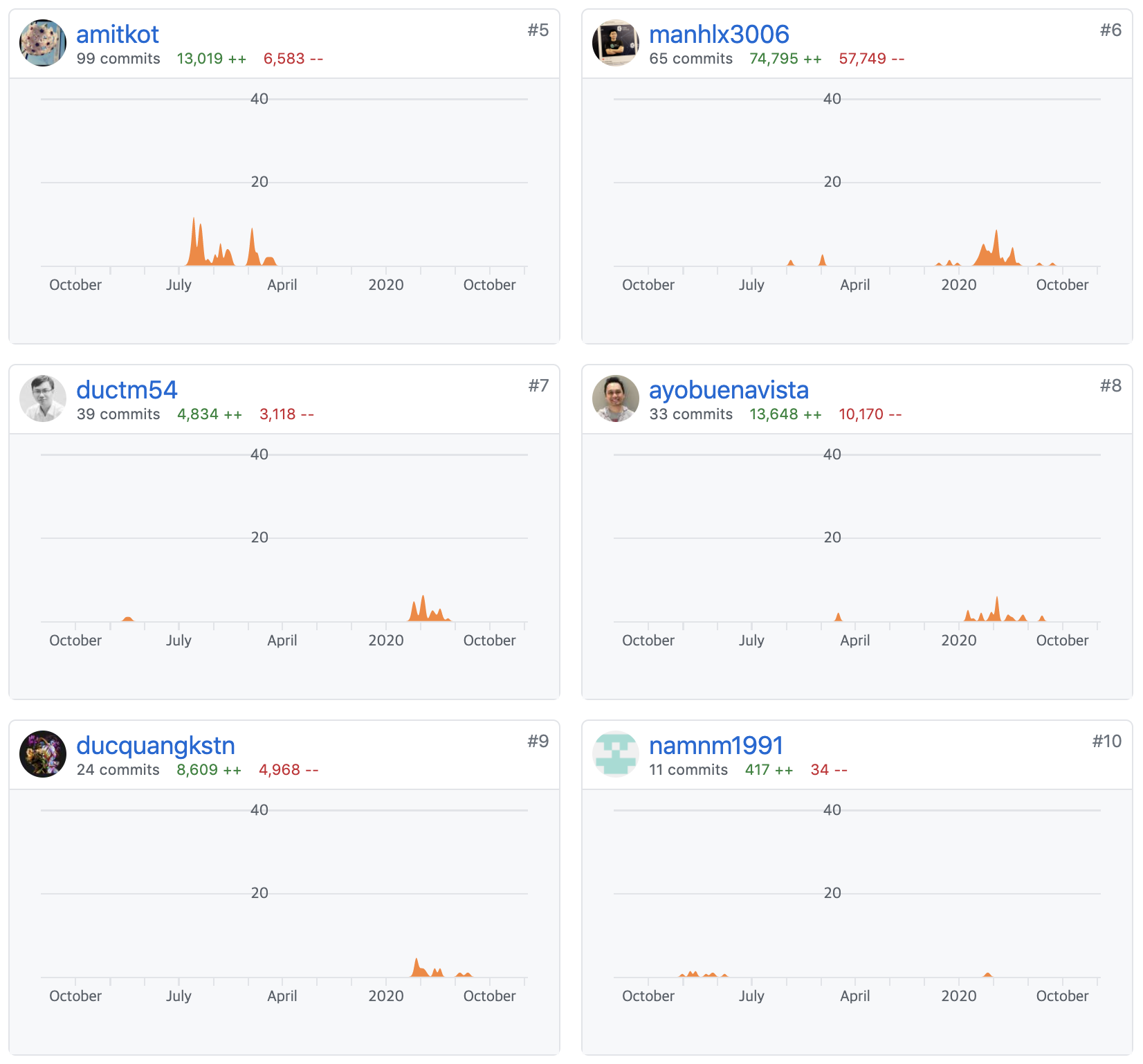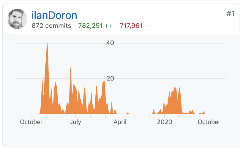 해당 프로젝트에서 핵심으로 개발하고 있던 개발자의 최근 개발 현황입니다. 최근들어 깃허브에서 개발 활동을 잘 하지 않는 것으로 보입니다.