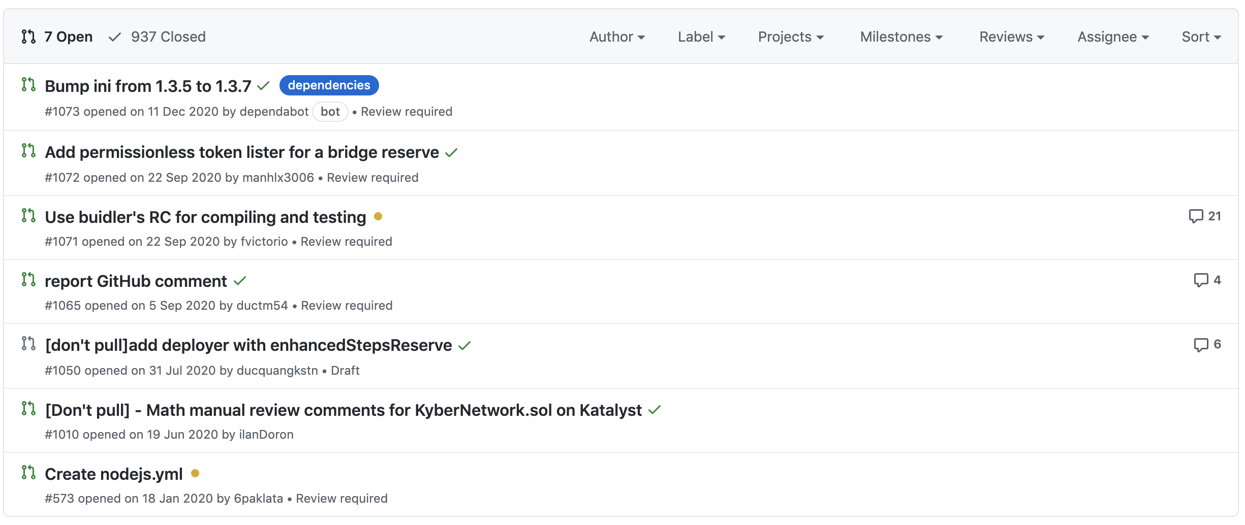 여기서도 조금 아쉬운 부분들은 2020년 중순에 올라온 PR들이 현재까지 병합되지 않고, 열려있는 상태로 유지되고 있다는 점입니다.