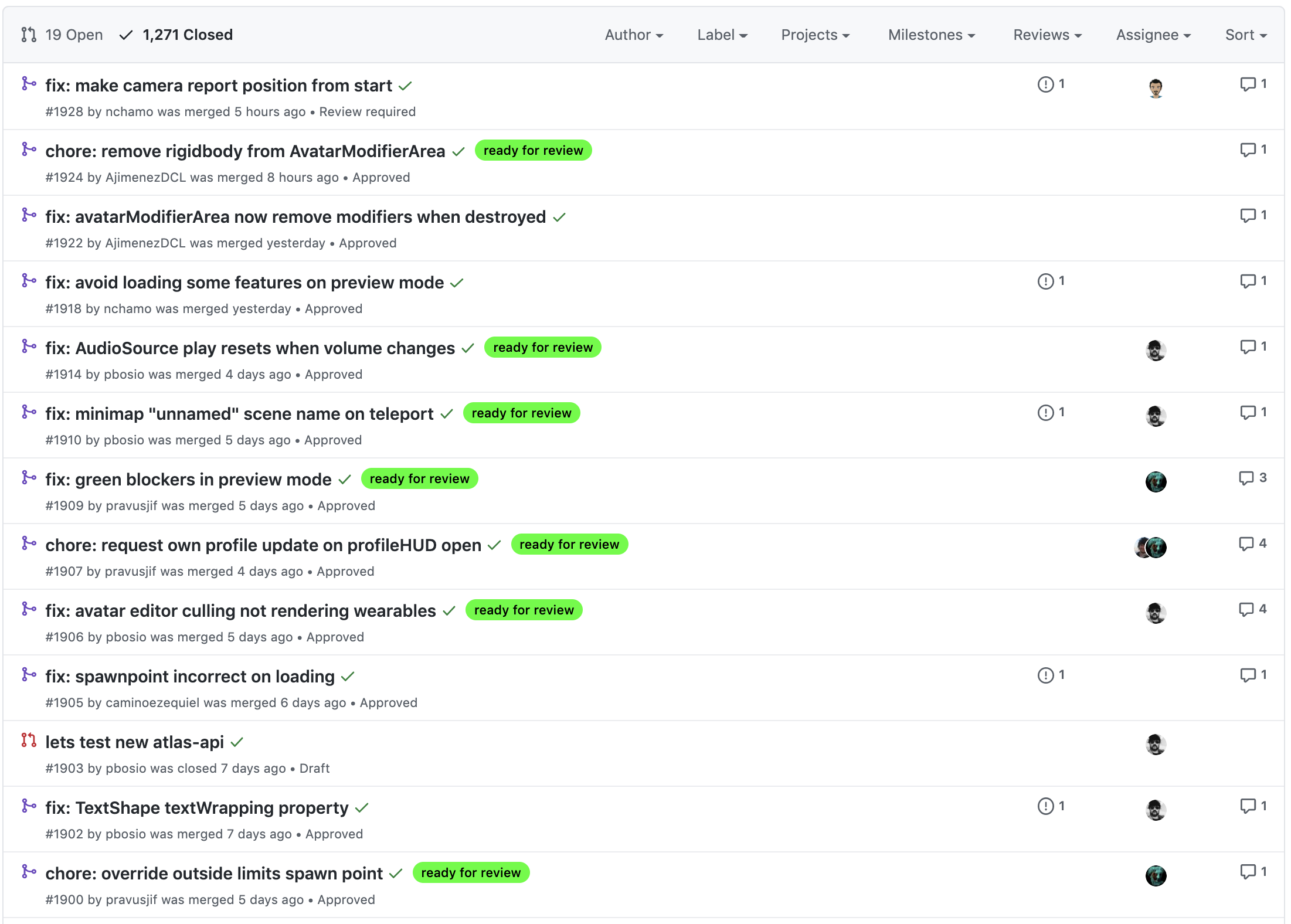 제가 언급한 깃 커밋 메시지 컨벤션을 도입해서 개발팀끼리 커밋 메시지를 맞춰서 작성하는 것을 확인할 수 있습니다. 디센트럴랜드 개발팀 내에 이러한 문화가 자리잡혀있는 것을 알 수 있습니다. (개발팀 내에 이러한 가이드가 존재한다는 것은 굉장히 좋은 문화입니다. 이런 부분 조차 없는 곳 굉장히 많아요)