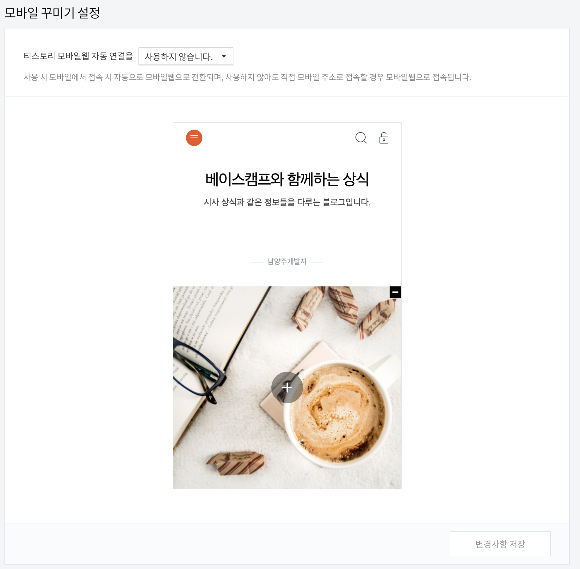 베이스캠프 스킨 반응형을 사용하기 위해 티스토리 관리자 > 꾸미기 > 모바일로 이동하면 모바일 꾸미기 설정 페이지로 이동하게 되는데 여기서 티스토리 모바일웹 자동 연결을 사용하지 않습니다.를 선택한 후 저장해 주세요.