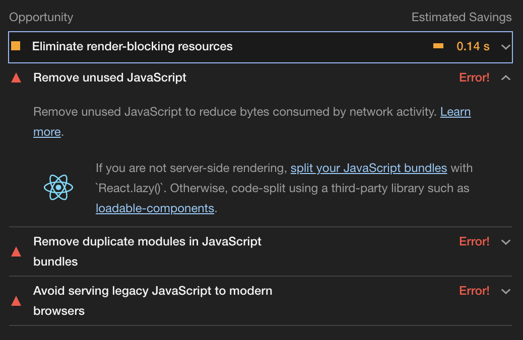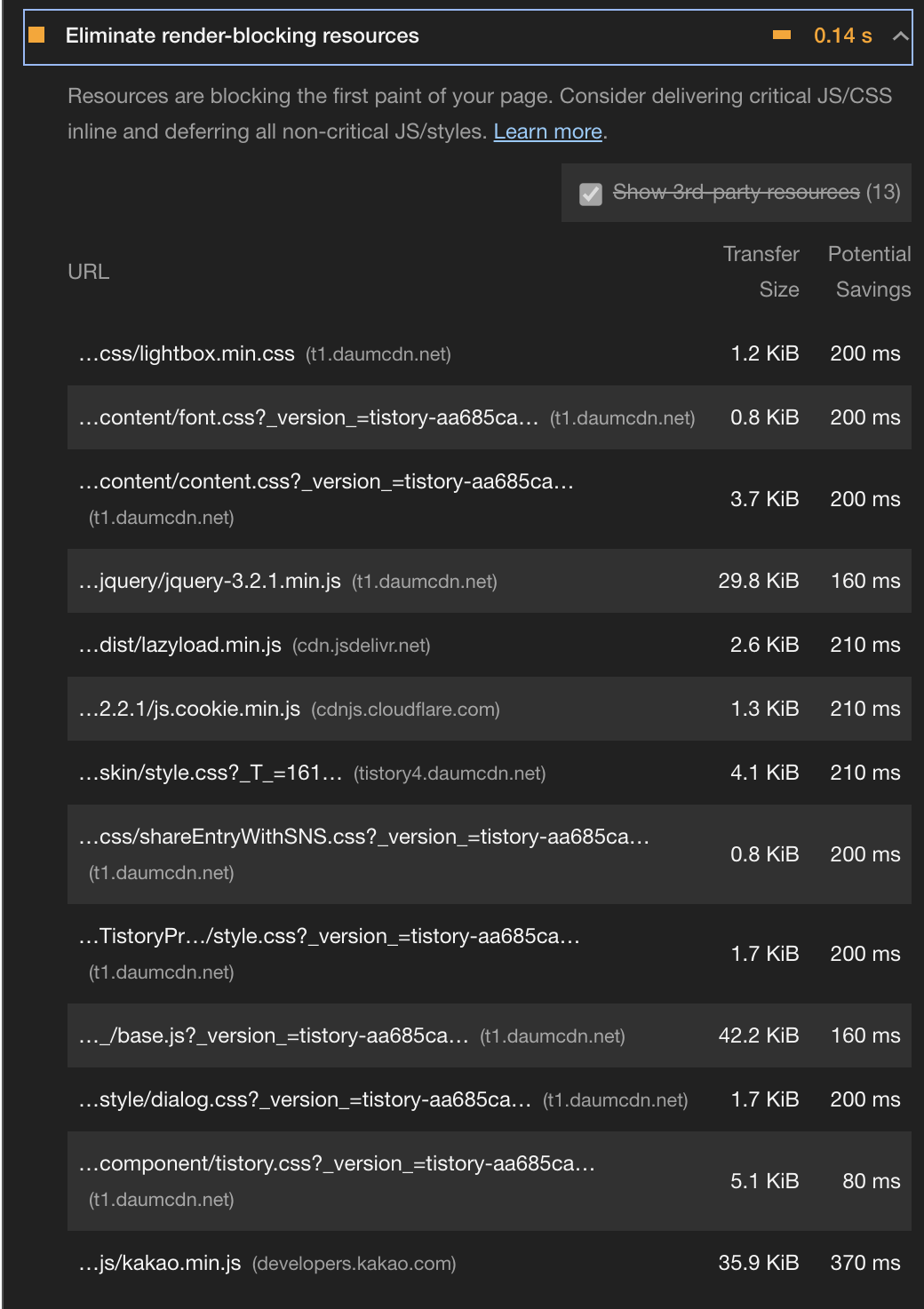 라이트하우스 퍼포먼스 부분에서 개선하지 못하는 부분은 티스토리에서 자동으로 삽입되는 스크립트가 대부분이라 스킨을 개발하는 개발자가 개선할 수 없는 영역입니다.