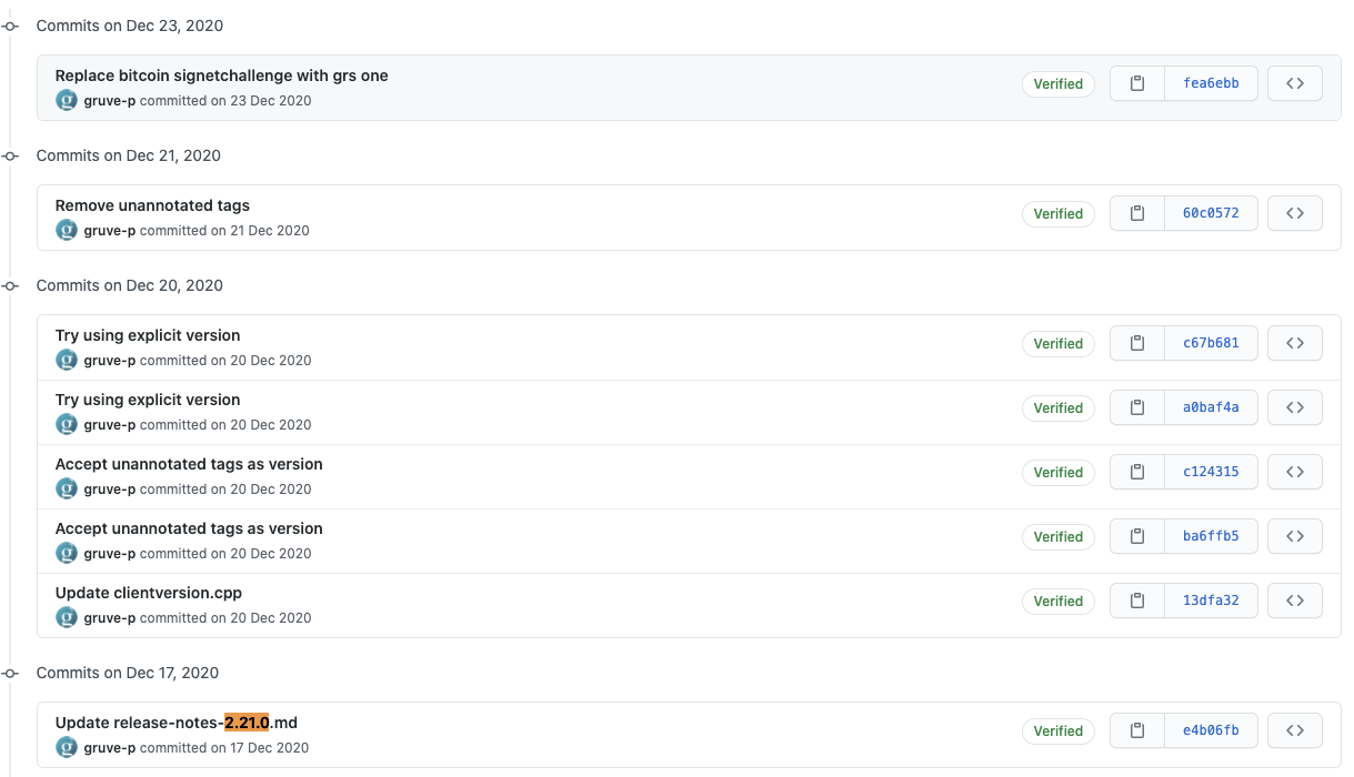 비트코인 2.21.0 버전으로 통합한 후 그로스톨 개발팀측은 7개의 커밋을 남겼는데, 1달이 넘는 기간동안 사실 7개 커밋은 굉장히 적은 횟수입니다. 커밋메시지가 더 중요하니 커밋 메시지도 한번 살펴보도록 하겠습니다.