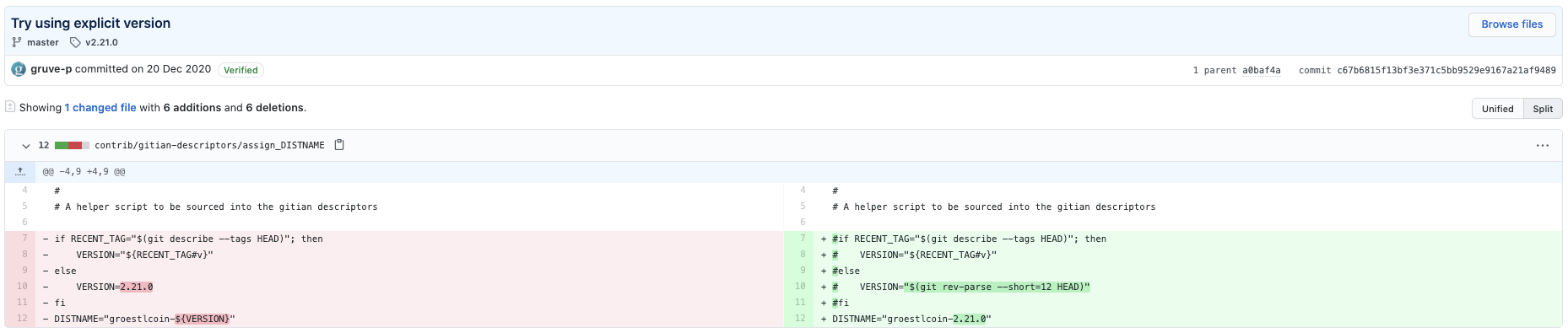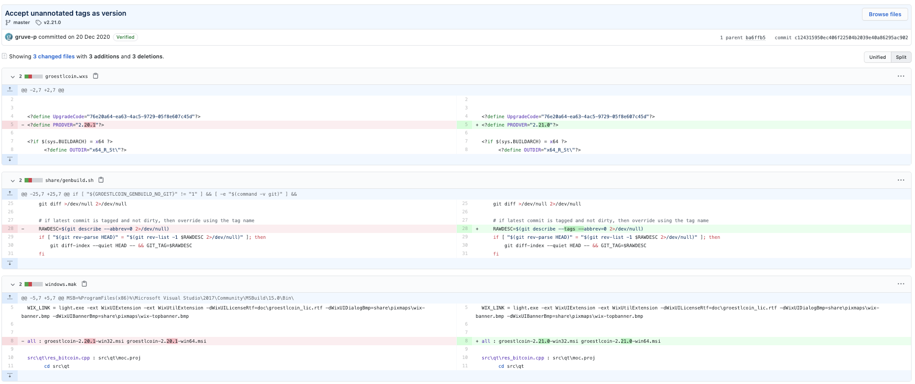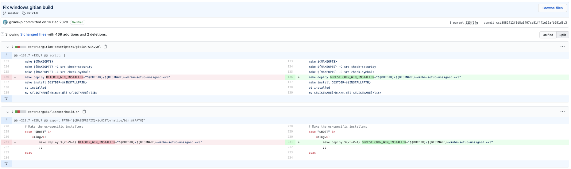 해당 커밋 기록도 BITCOIN_WIN_INSTALLER -> GROESTLCOIN_WIN_INSTALLER 단순 배포(deploy) 경로 변경 수준으로 사실 의미없죠. 아래 많은 수정 사항이 있는 것 같아 살펴보니 release-notes=2.21.0 리드미파일 수정..ㅋㅋ