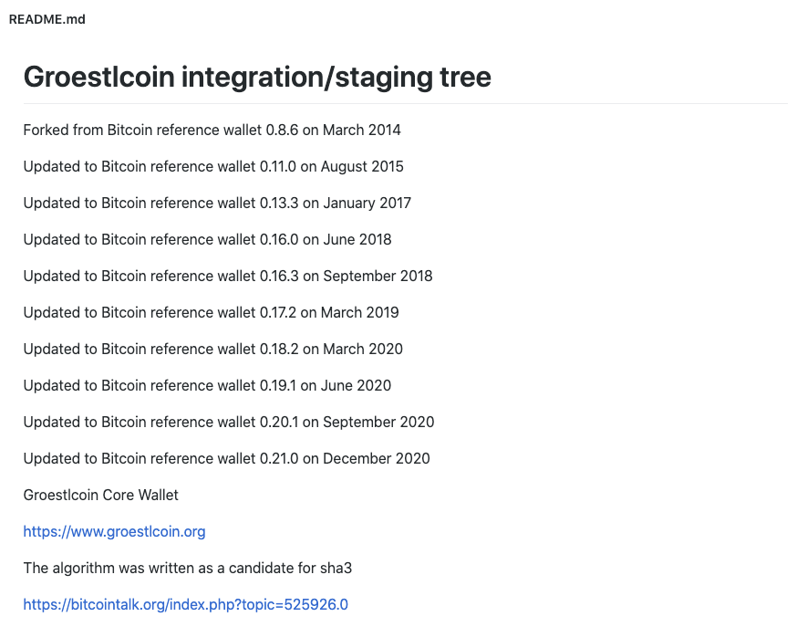 리드미 문서를 살펴보면 그로스톨코인은 최근에 비트코인 0.21.0 버전을 병합하면서 업데이트되었다는 것을 명시하고 있습니다.
