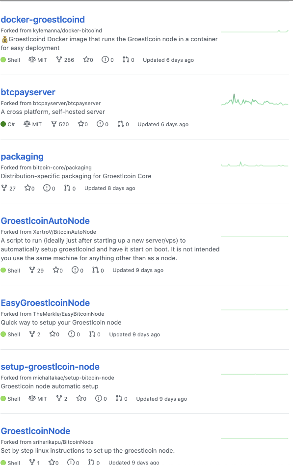 그로스톨코인 깃허브 오픈소스 프로젝트 업데이트 현황을 살펴보면 올해 굉장히 많은 프로젝트들이 업데이트되는 것을 확인할 수 있는데, 좀 아쉬운 점은 직접 프로젝트를 처음부터 개발하는 저장소는 존재하지 않고, 최근 업데이트된 모든 항목들은 모두 타 프로젝트를 포크해서 생성된 프로젝트입니다. (모든 프로젝트들이 포크된 프로젝트들이라 좀 당황했네요...ㅋㅋ)